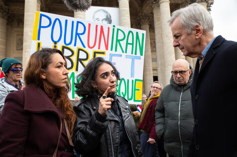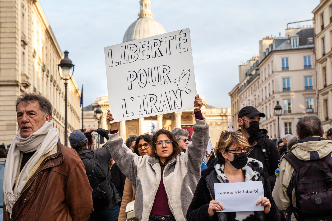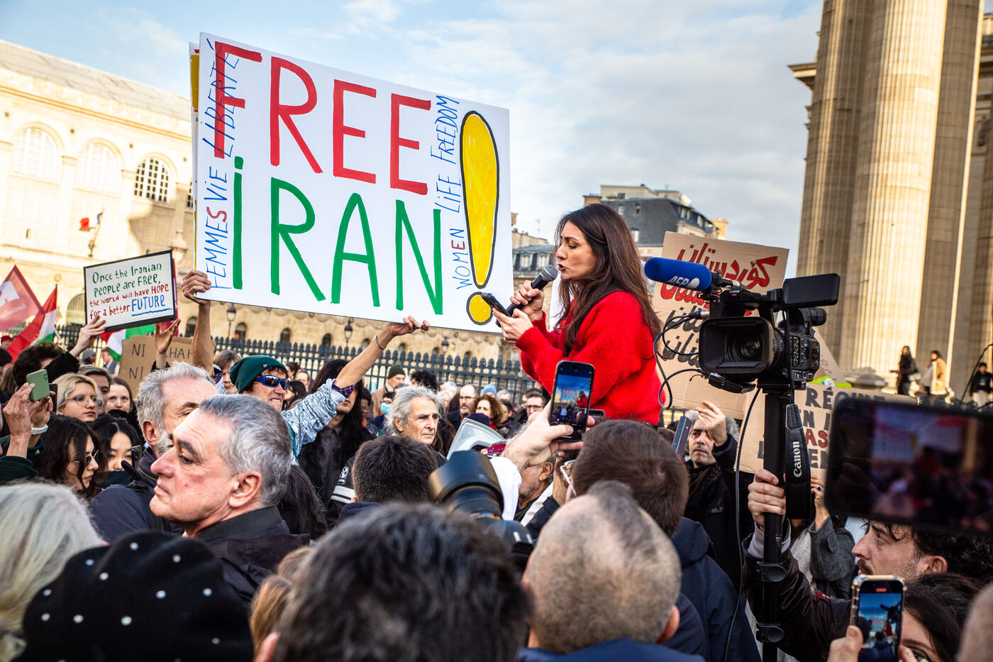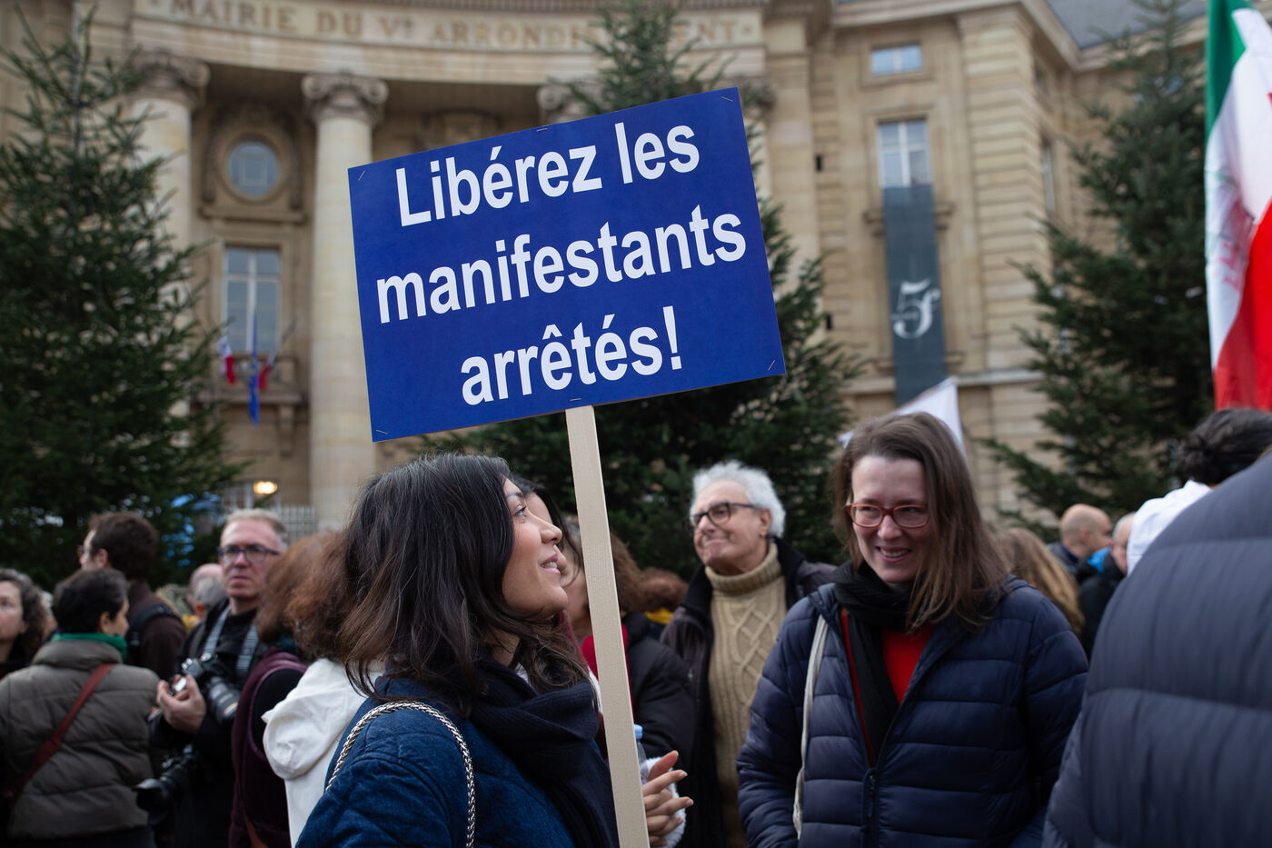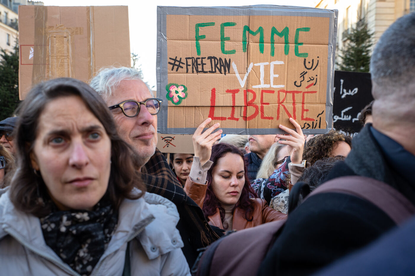 France, Paris, place du Pantheon, le 17 Janvier 2026. Manifestation solidaire en soutien au peuple iranien, tres fortement reprime par le regime autoritaire theocratique des mollahs lors de recentes manifestations de contestation.
