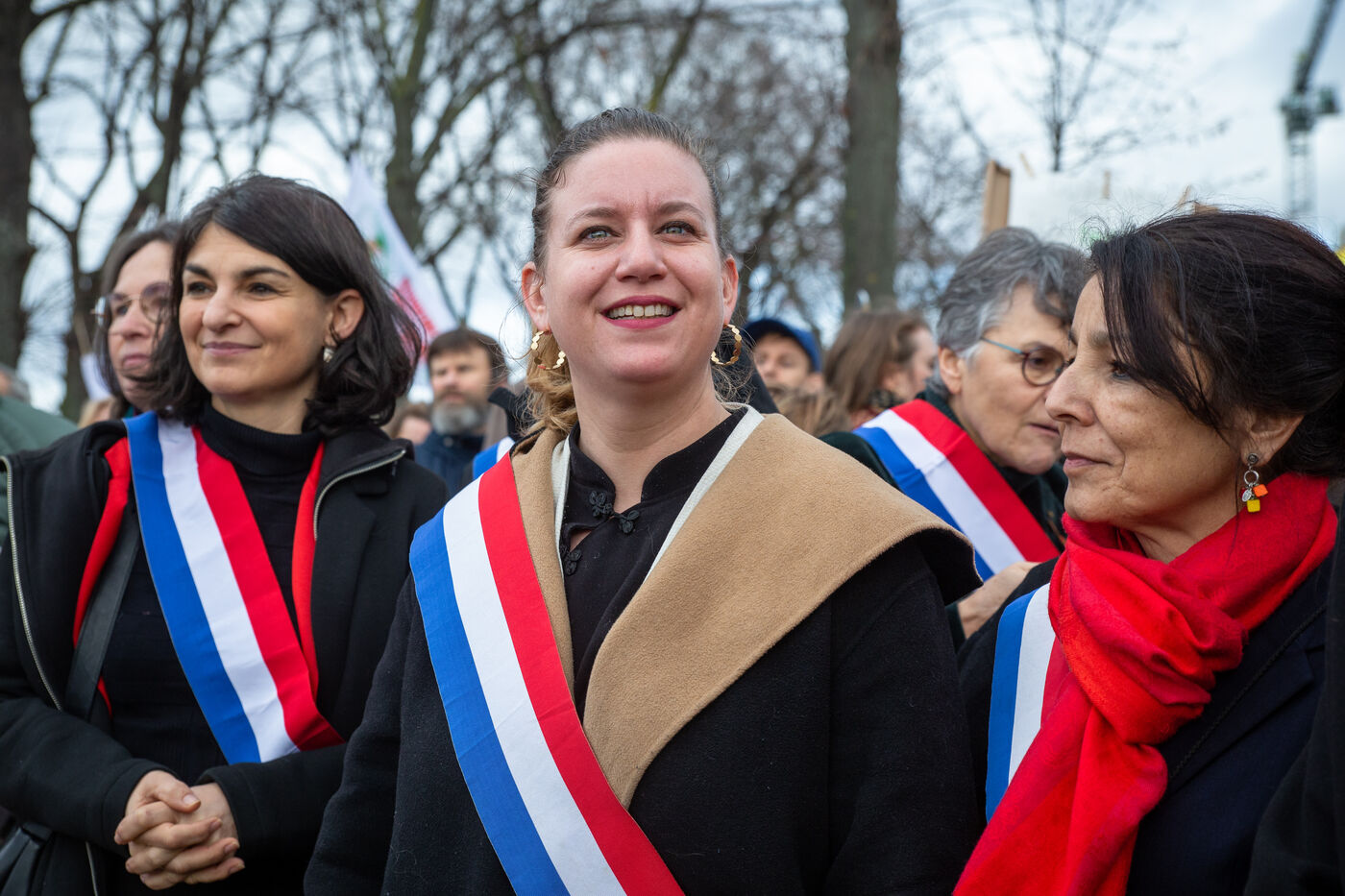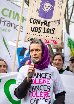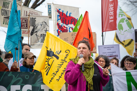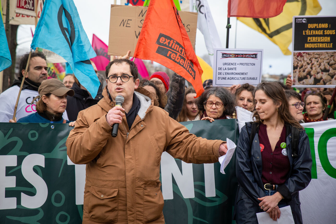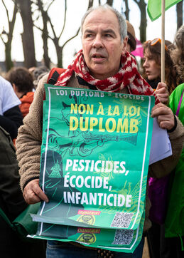 France, Paris, le 11 fevrier 2026. Mobilisation pour la sante, l environnement et les paysans. Associations environnementales, elus, collectifs de scientifiques et de victimes sont venus manifester leur opposition aux pesticides et soutenir la proposition de loi Raux sur la protection des points de captage d eau potable. A l Assemblee, apres une petition record de plus de 2 millions de signatures, la representation nationale doit consacrer une seance a la mobilisation citoyenne contre la loi Duplomb et a son modele agricole.