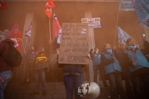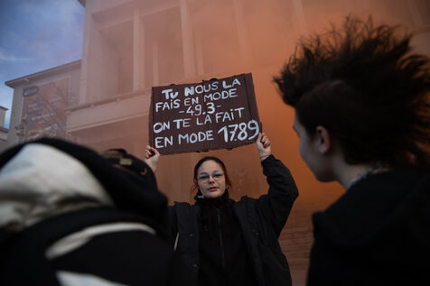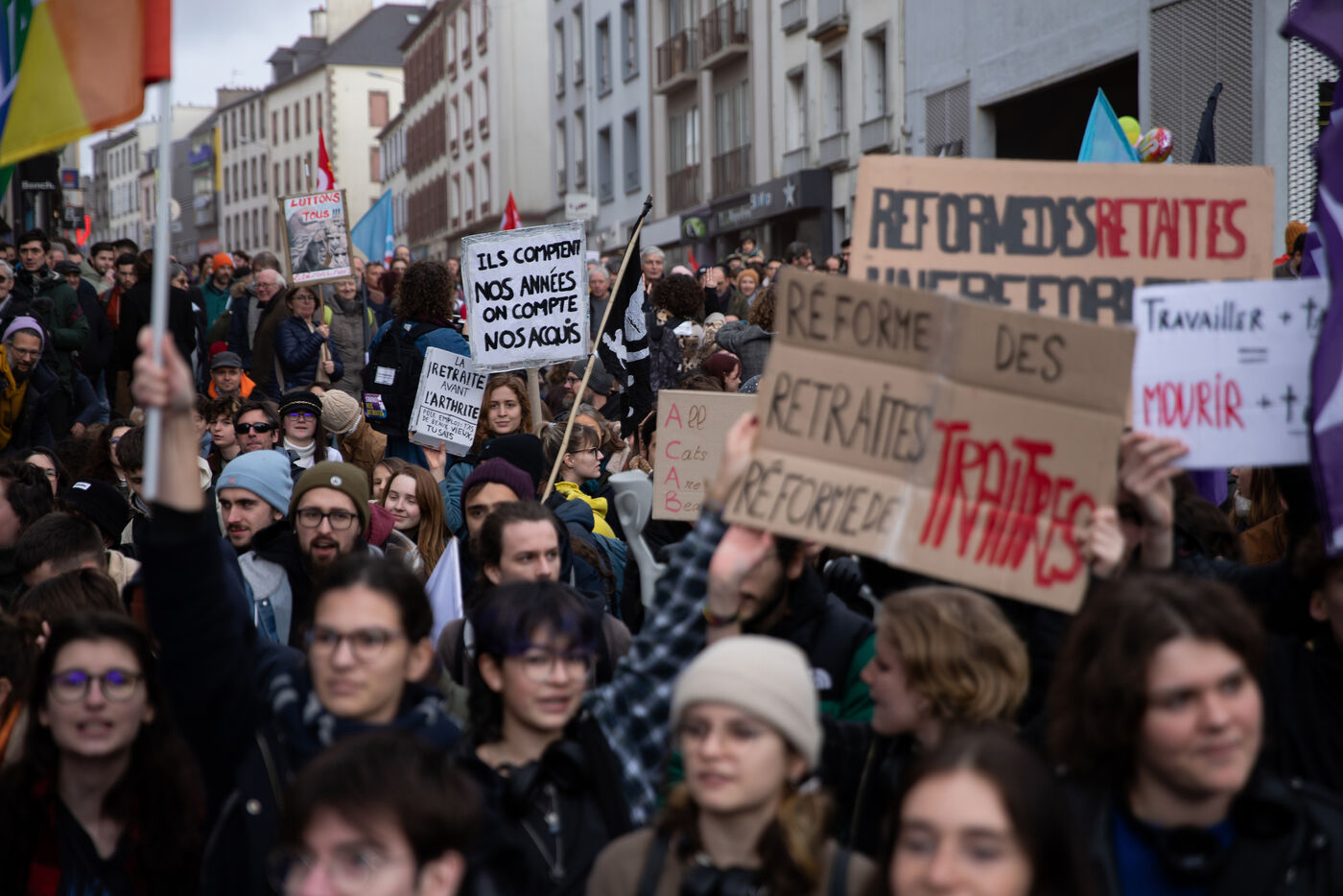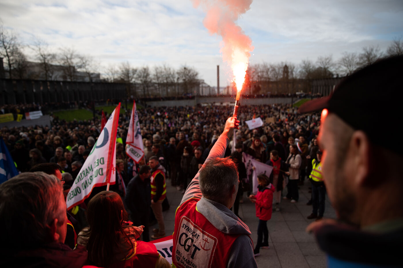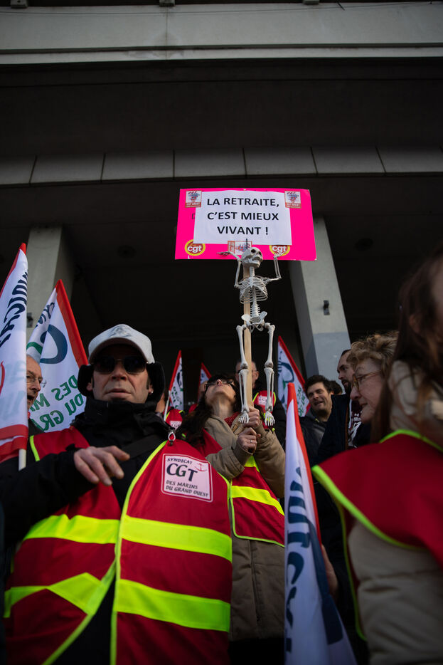 France, Brest, 2023-01-31. Second day of demonstration against the reform of the pensions. A human tide breaks in the streets of Brest where more than 20,000 people beat the pavement. Photograph by Vincent Feuray / Hans Lucas.