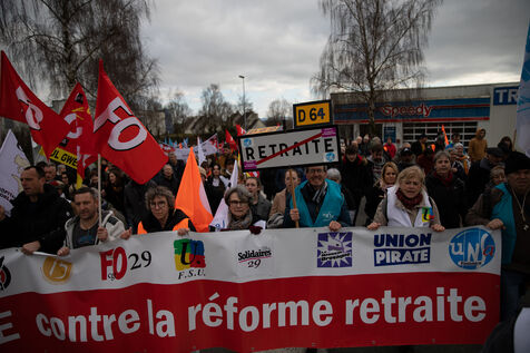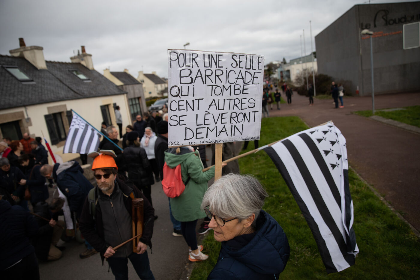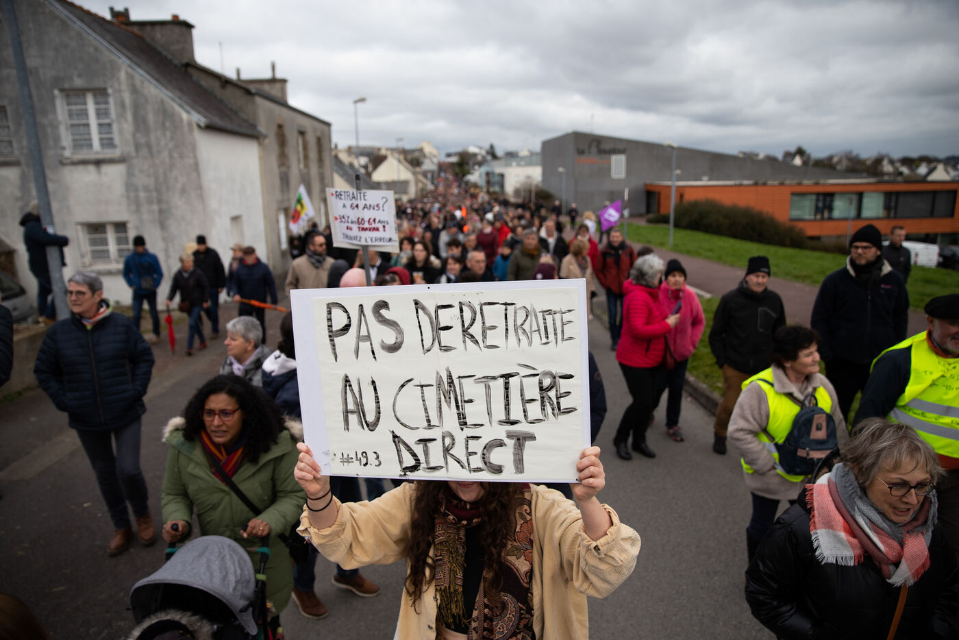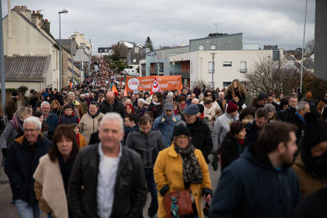 France, Saint-Martin-des-Champs, 2023-02-11. Fourth day of demonstrations against the pension reform. A wind of anger blows in the countryside. Historic mobilization in the small Breton town of 5000 inhabitants which saw about 12000 people demonstrating.