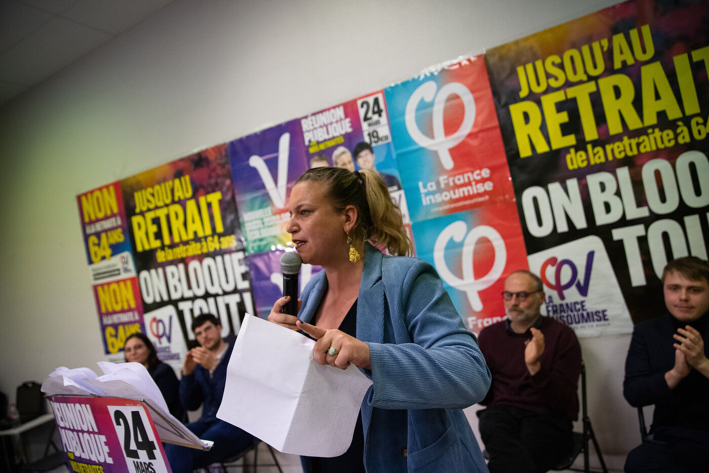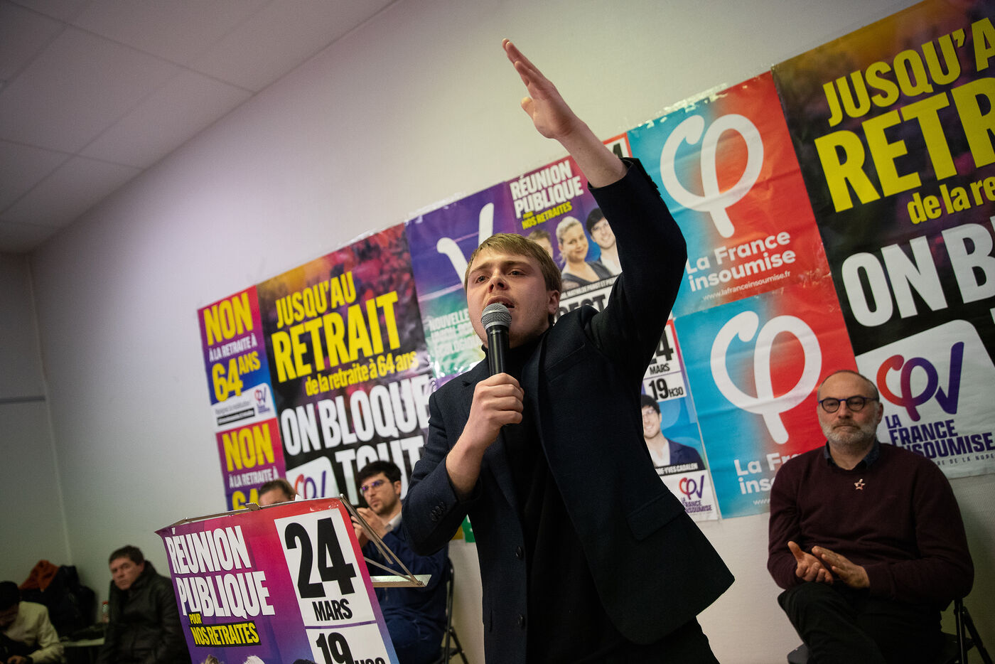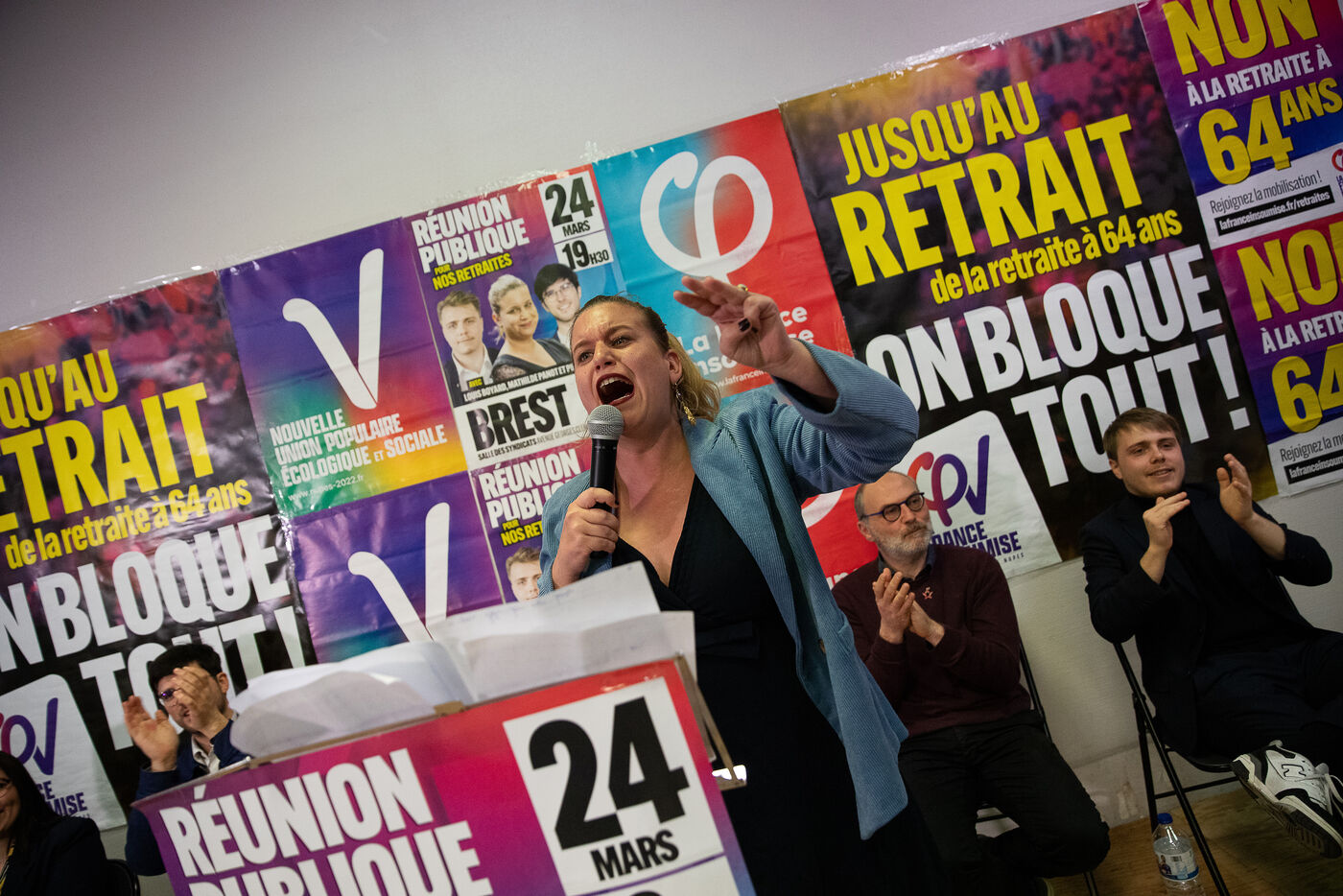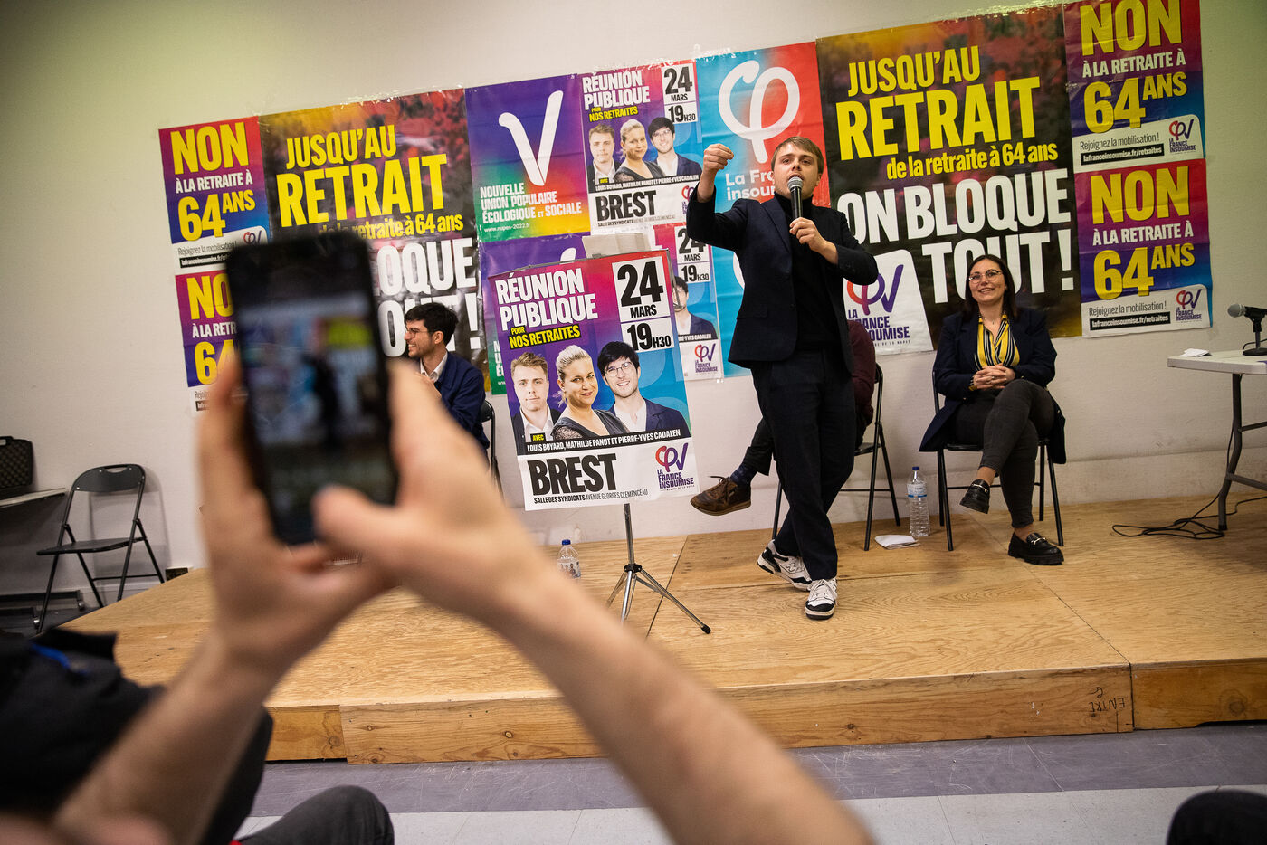France, Brest, 2023-03-24. Plus de 500 personnes assistent à une reunion publique offensive contre la reforme des retraites des députés Nupes Mathilde Panot et Louis Boyard. Un groupe de militants d'extrême droite a tenté de perturber le meeting en vain. Photographie de Vincent Feuray / Hans Lucas.