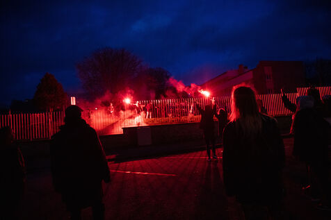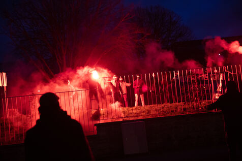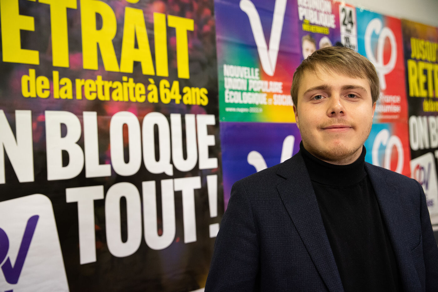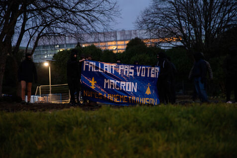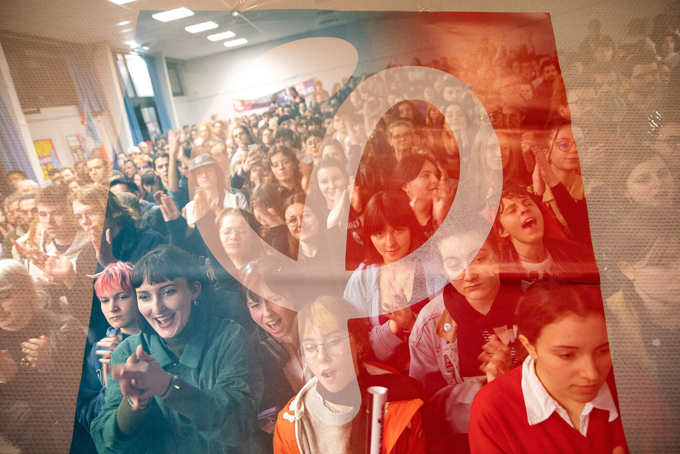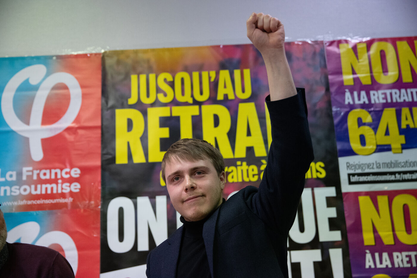 France, Brest, 2023-03-24. Plus de 500 personnes assistent à une reunion publique offensive contre la reforme des retraites des députés Nupes Mathilde Panot et Louis Boyard. Un groupe de militants d'extrême droite a tenté de perturber le meeting en vain. Photographie de Vincent Feuray / Hans Lucas.