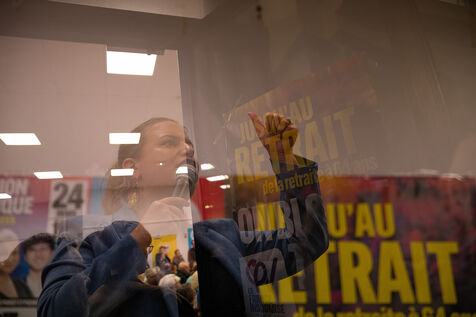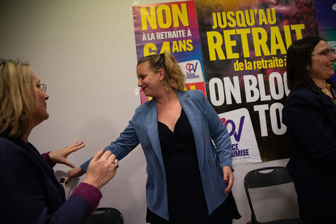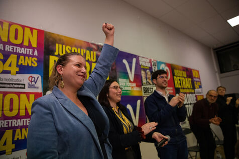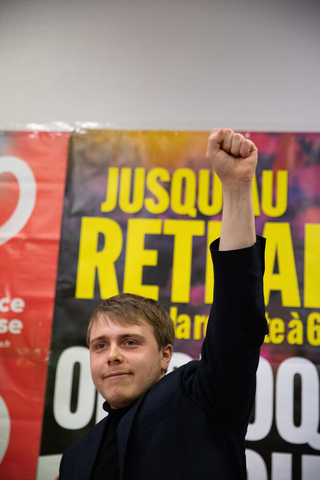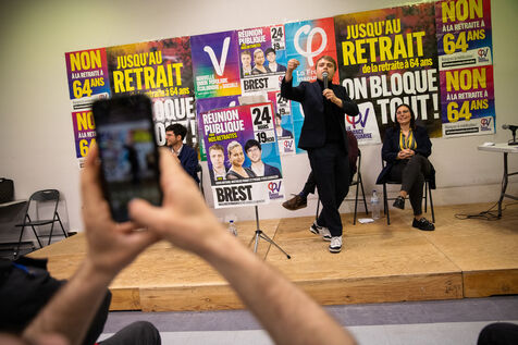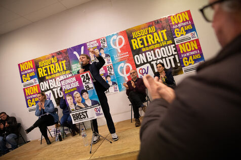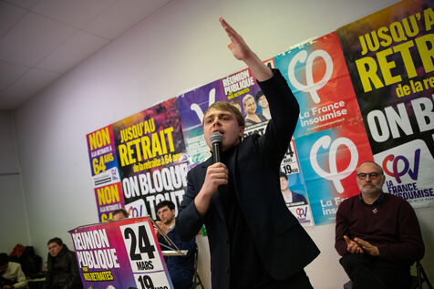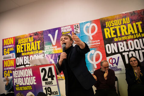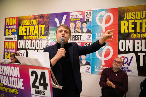 France, Brest, 2023-03-24. More than 500 people attend a public meeting against the pension reform of the Nupes deputies Mathilde Panot and Louis Boyard. A group of right-wing activists tried to disrupt the meeting but failed. Photo by Vincent Feuray / Hans Lucas.