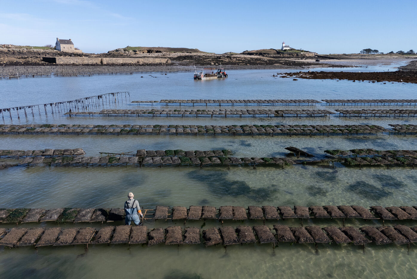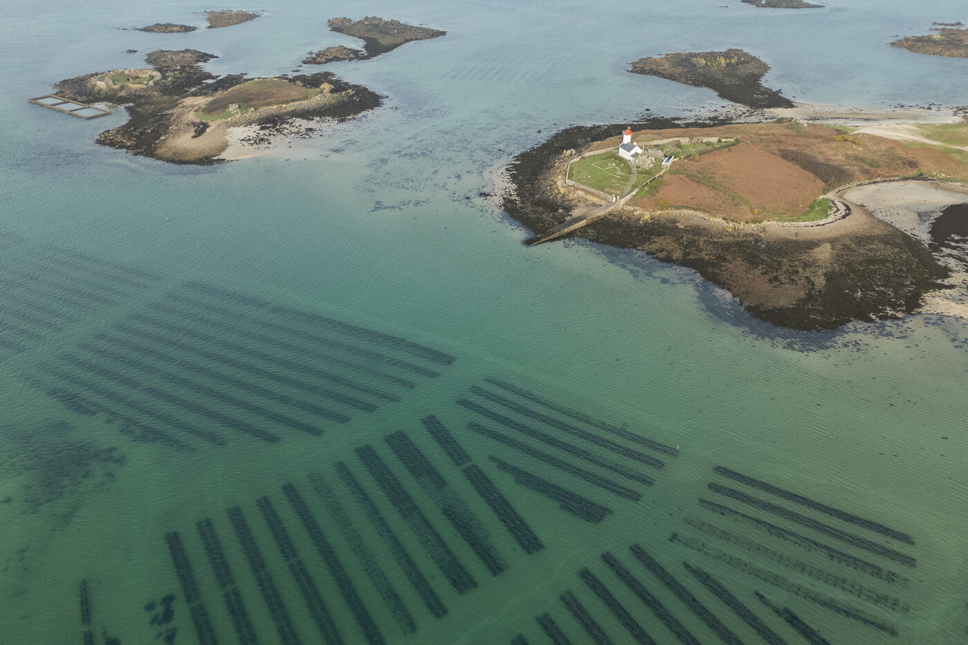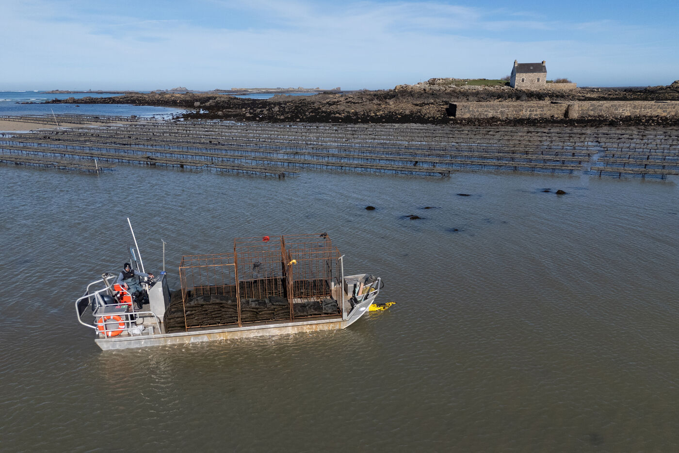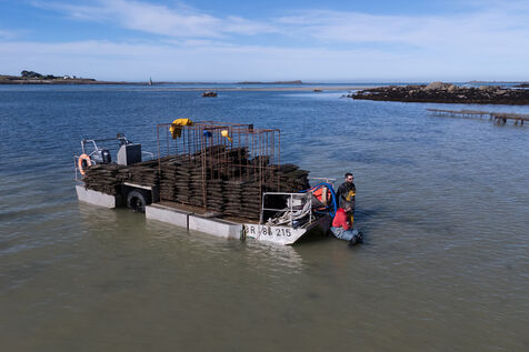 Between the Atlantic Ocean and the English Channel, on the coast of northern Finistère, lies the Lilia archipelago on the commune of Plouguerneau. Dominated by the silhouette of the Île Vierge lighthouse, the landscape is breathtaking. It is in this exceptional setting, surrounded by rich and unspoiled nature, that the Legris company has been cultivating its oysters since 1986. An activity that demands constant attention. At every high tide, a strange ballet unfolds on the foreshore. The tables holding the oyster bags are uncovered, allowing the oyster farmers to shake and turn the bags containing the precious mollusks. Stirred regularly, the oysters thus maintain a balanced shape. It takes between three and five years to produce a product that is now widely renowned, the result of passionate work that is regularly recognized. To appreciate the scale of the task and enjoy an impressive spectacle, you need to get a bird’s-eye view. A flight over the Legris oyster beds in Lilia.