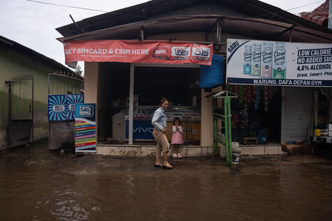 Le 25 février 2026, de fortes pluies ont entraîné des inondations dans plusieurs quartiers près de Denpasar sur l'île de Bali en Indonésie. Les rues et les commerces de proximité ont été envahis par l'eau, obligeant les habitants et les conducteurs de scooters à se déplacer dans des rues submergées.