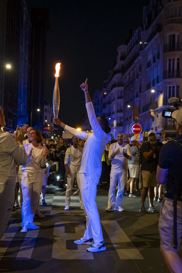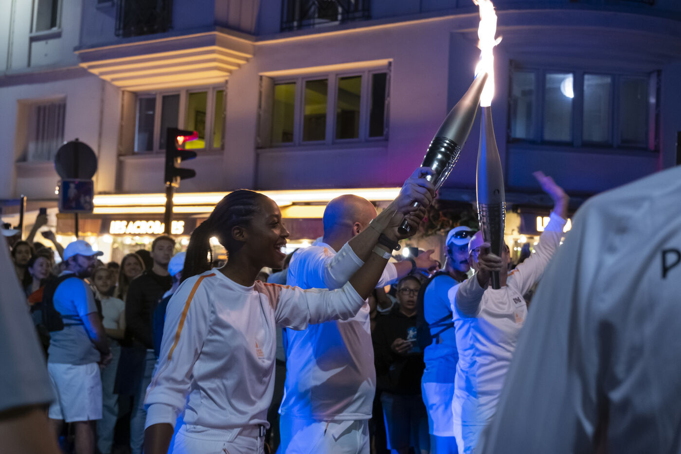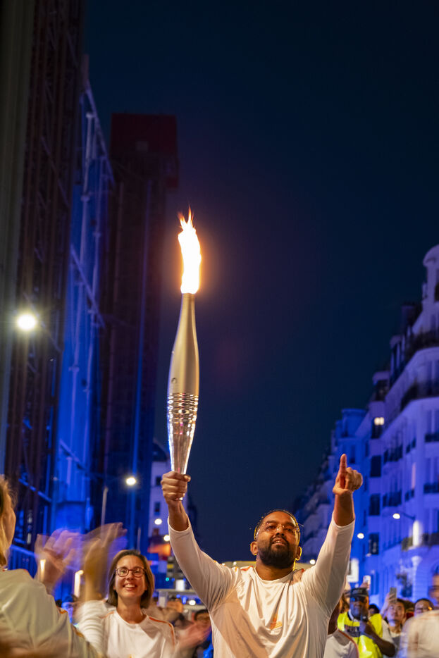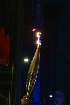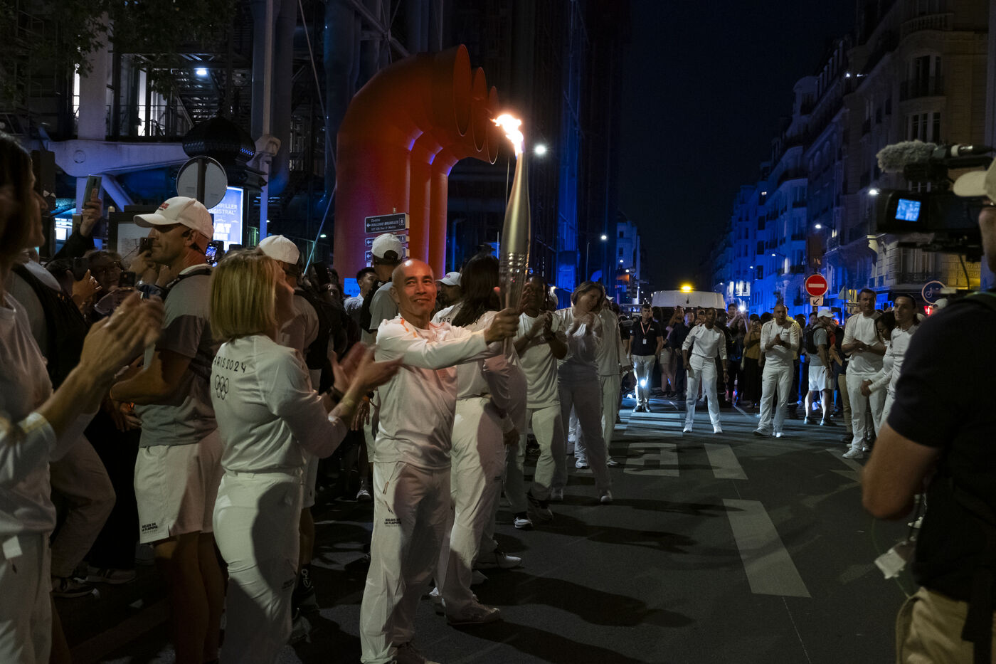 Passage de la flamme olympique derrière Beaubourg à paris le 14 Juillet 2024.