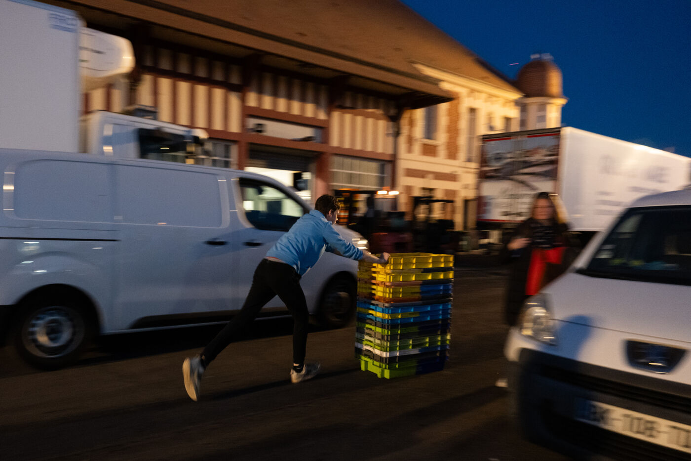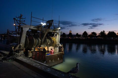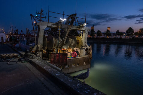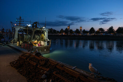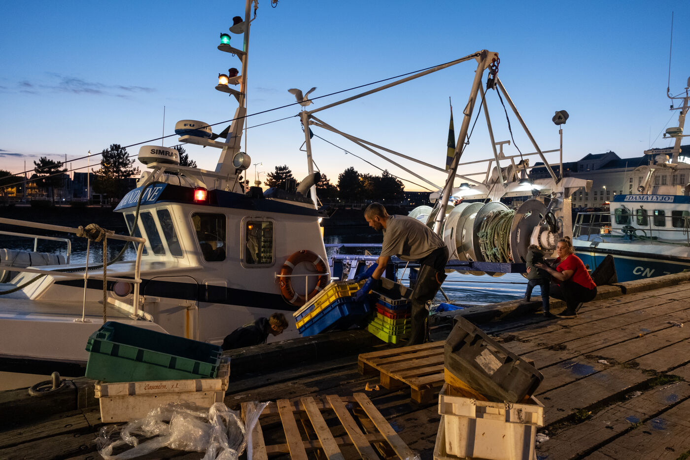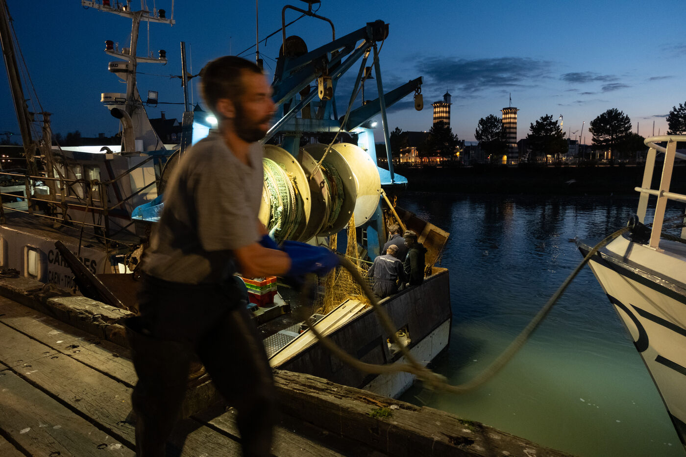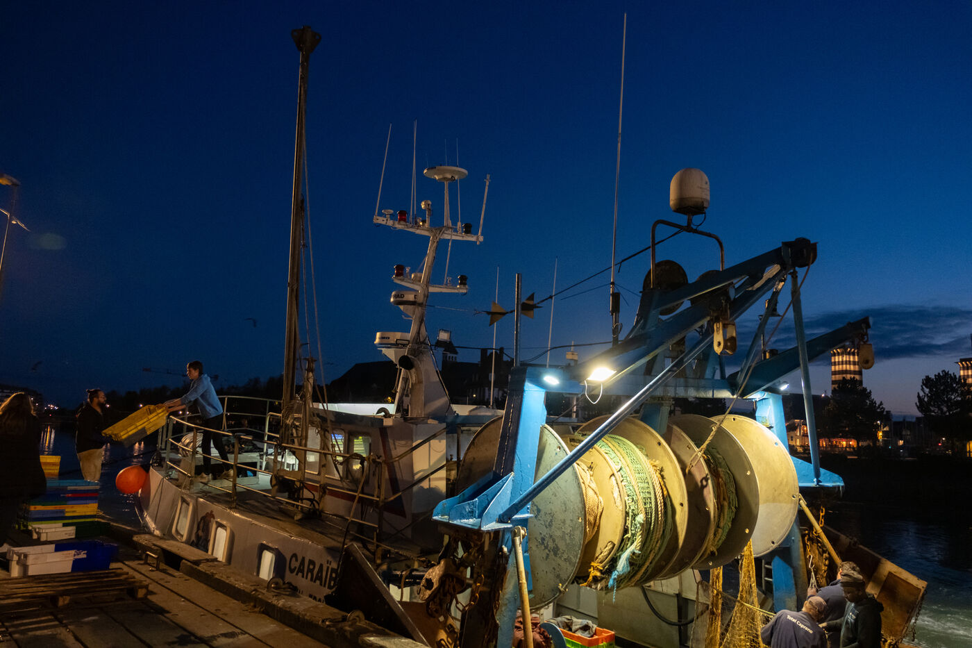 Préparation des bateaux lors d'un retour et nouveau départ de pêche sur le port de Trouville-sur-Mer.