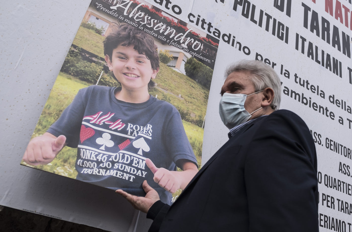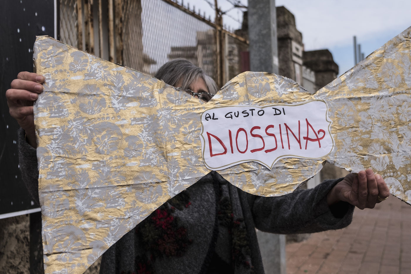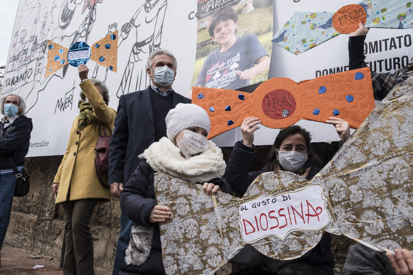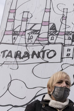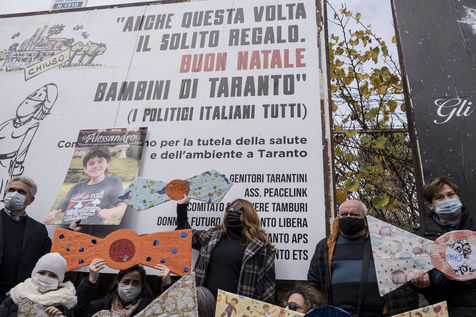 Des manifestants protestent contre l'aciérie ArcelorMittal (ex Ilva), qui prétendument cause des problèmes environnementaux et de santé parmi la population locale. ArcelorMittal a récemment signé un accord avec le gouvernement italien pour former un accord privé-public. L'accord prévoit aussi que la production d'acier augmente dans les prochaines années. Les manifestants ont affiché au mur une affiche lisant "Le même cadeau à nouveau''. Joyeux Noël aux enfants de Tarente de la part des politiciens italiens." Ils ont aussi fait des bonbons en carton étiquetés avec des agents polluants, à signifier que la contamination est l'unique cadeau que les enfants de Tarente vont recevoir du gouvernement à Noël.