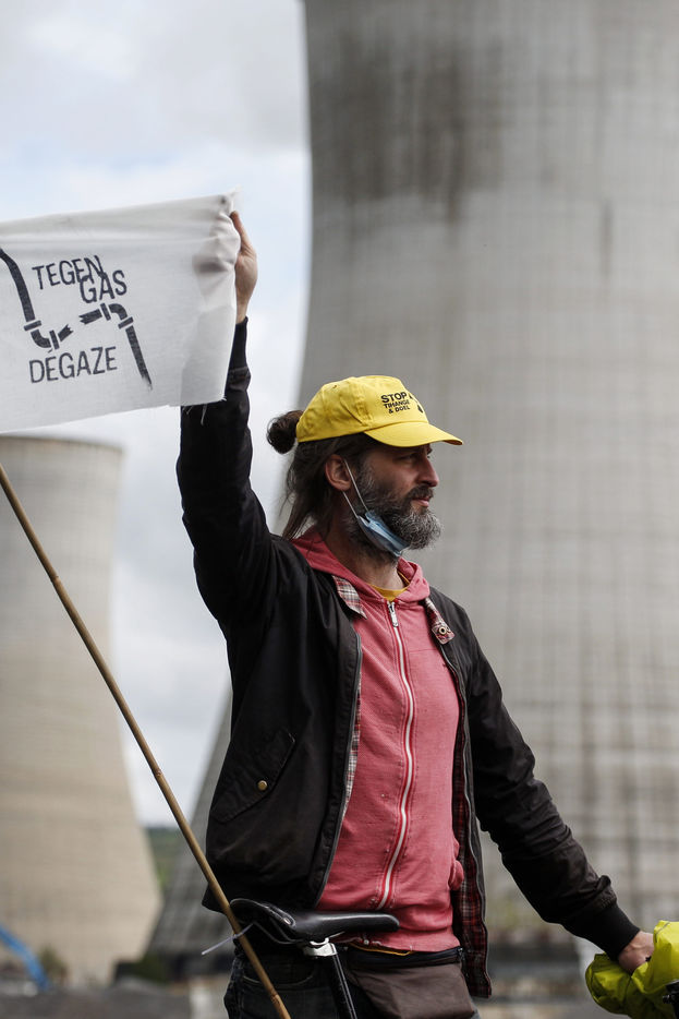 Environmentalist bikers demonstrate in front of Tihange nuclear plant. The demonstration is part of the Degaze tour, a 6-day biking tour linking 8 sites in Belgium where the construction of new gas power plants has been planned.