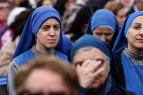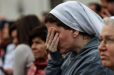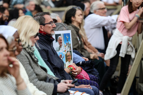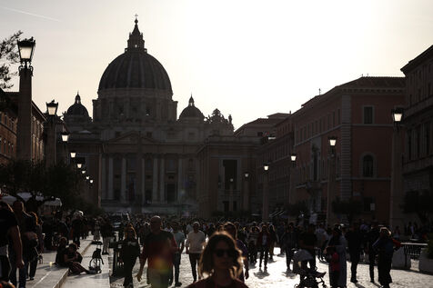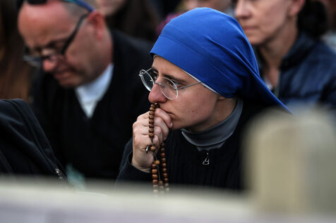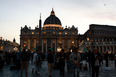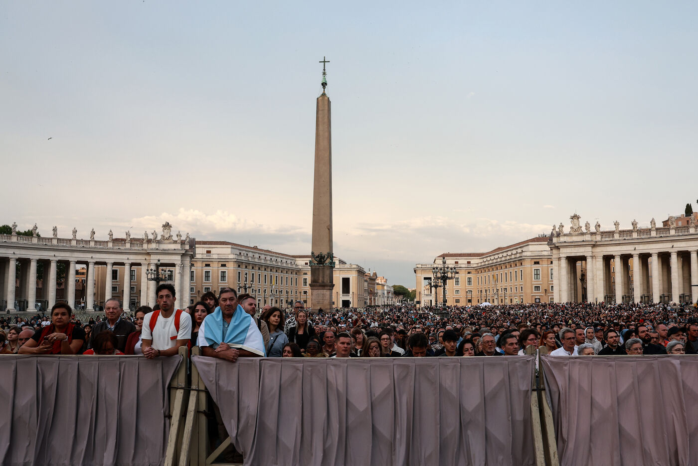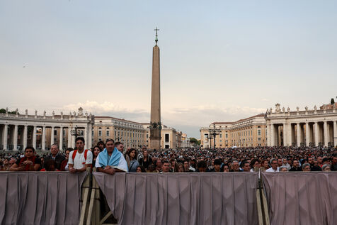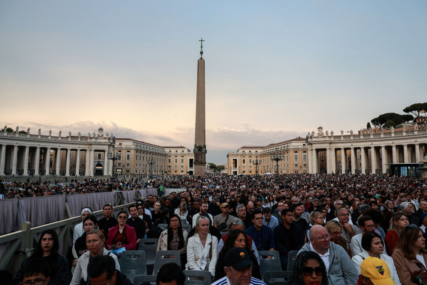Faithful attend a rosary in homage to Pope Francis following his death in Saint Peter's Square in Vatican City, Vatican on April 21, 2025. The Vatican announced that Pope Francis, 88, died on April 21st in the morning.