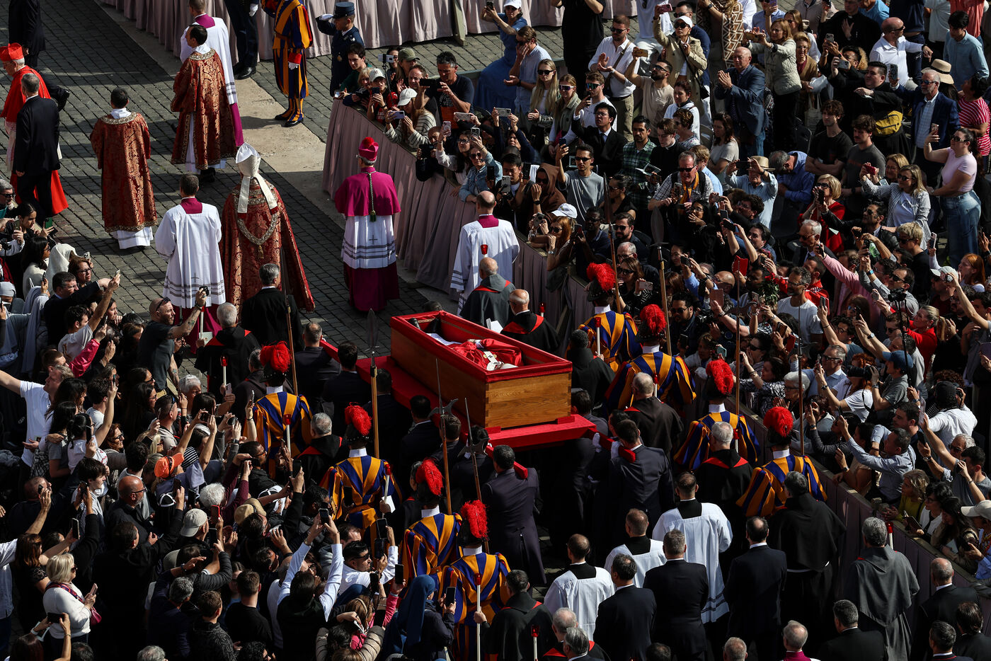Le cercueil du défunt pape François est transporté à la basilique Saint-Pierre après sa mort, au Vatican, le 23 avril 2025. Le Vatican a annoncé que le pape François, 88 ans, est décédé le 21 avril au matin.