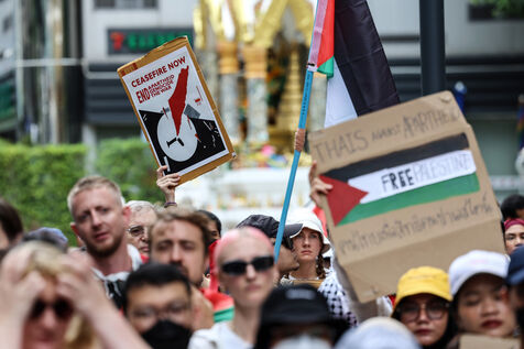 Manifestation pro-Palestine à Bangkok, en Thaïlande, le 15 juin 2025. Alors que l'Égypte a bloqué l'approche de la Marche mondiale vers Gaza avant qu'elle rejoigne la frontière de Rafah, les manifestants ont appelé à la fin du génocide, de l'apartheid et de l'occupation.