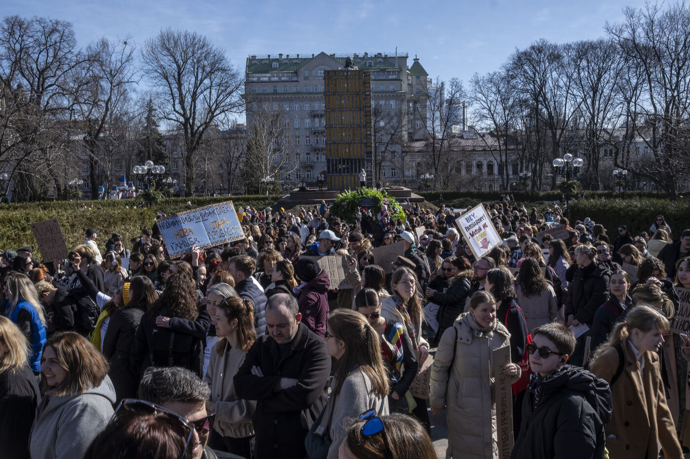 Des centaines de personnes se sont rassemblées dans le par Shevchenko de Kiev, en Ukraine, à l'occasion de la Journée des droits des femmes, le 8 mars 2026. La Marche des femmes à Kiev appelle à une protection renforcée des droits des femmes pendant la guerre : soutien et sécurité pour les femmes servant dans l'armée, action pour libérer les femmes détenues par la Russie et opposition aux changements législatifs susceptibles d'affaiblir les droits des femmes. Les participantes réclament protection, justice et une voix pour toutes les femmes en Ukraine.