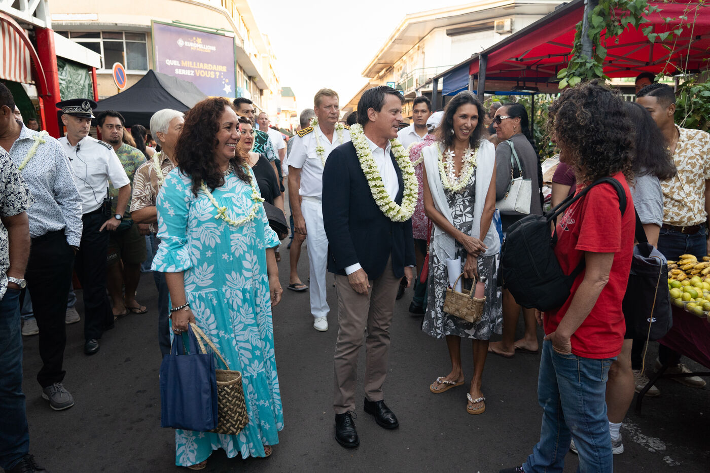 Manuel Valls, the French Minister of the Overseas Territories, visits the city market of Papeete on a Sunday morning and its exhibitors of fruits, vegetables, fish, craftsmen.
