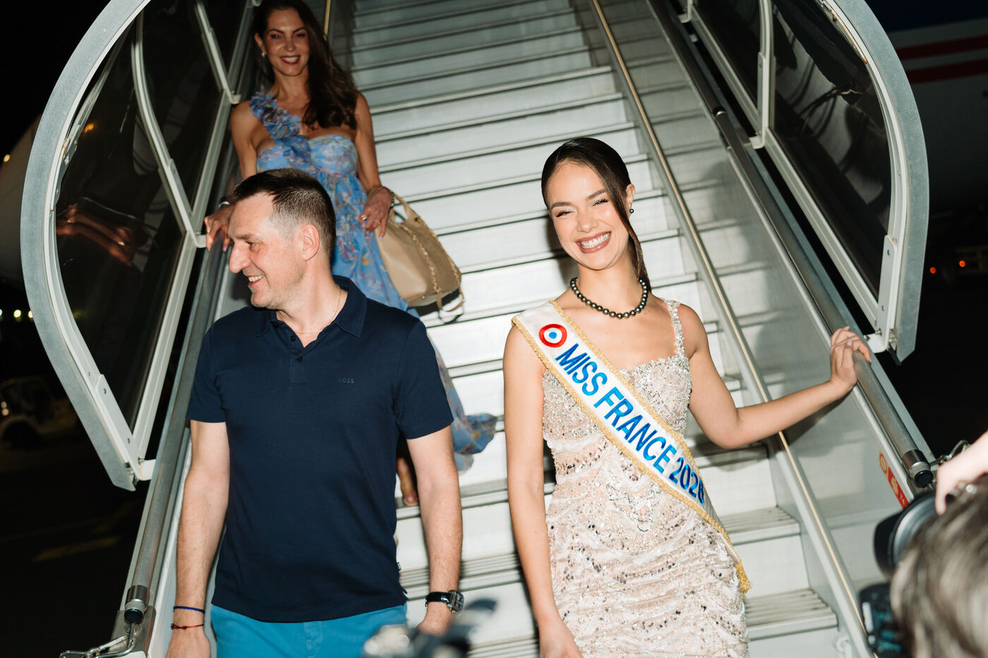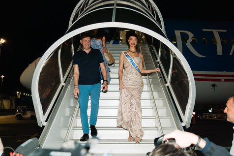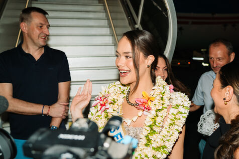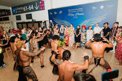 Hinaupoko Devèze, Miss Tahiti 2025 élue Miss France 2026, arrive pour la première fois depuis son sacre Miss France à Tahiti. Elle est accueillie par les autorités locales, par un spectacle de chant et danse marquisiens et par la population venue nombreuse.