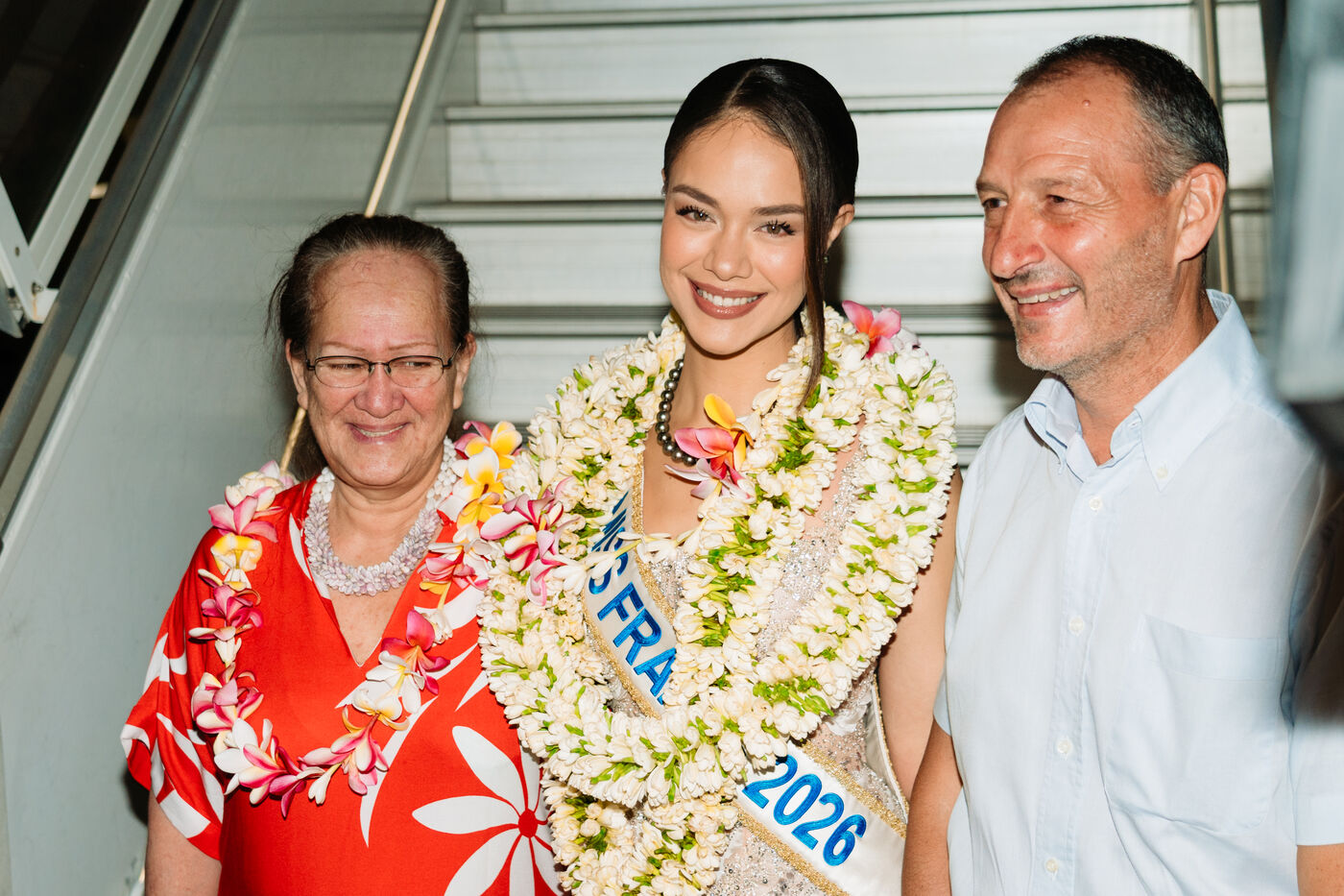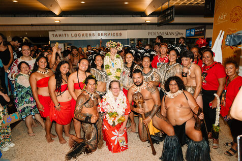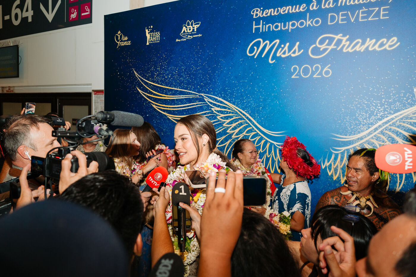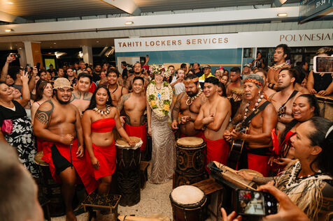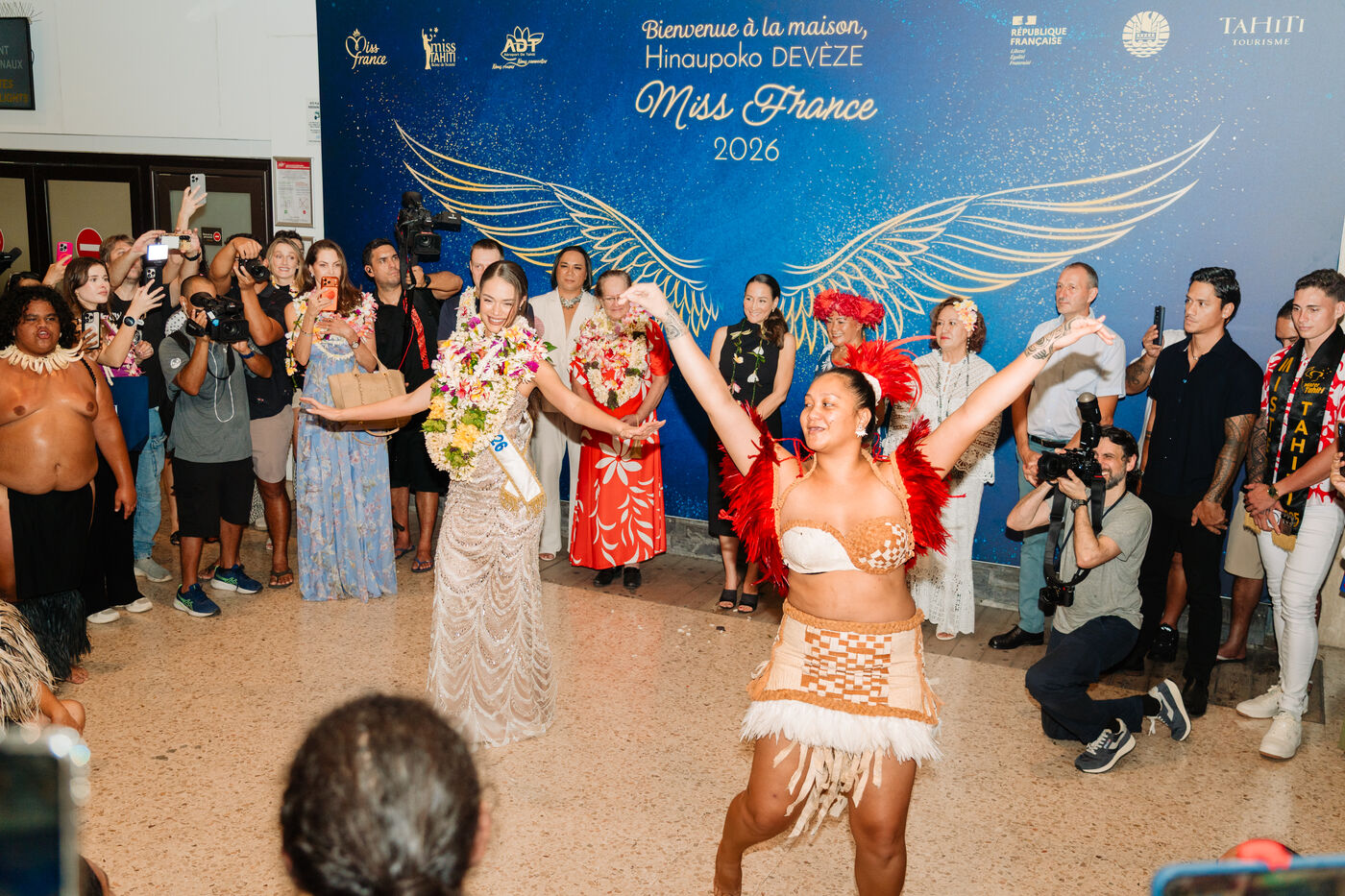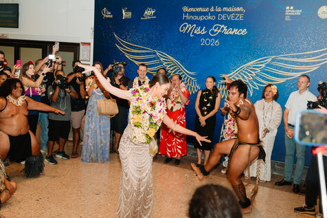 Hinaupoko Devèze, Miss Tahiti 2025 and Miss France 2026, arrives in Tahiti for the first time since her crowning. She is welcomed by local authorities, a Marquesan song and dance performance, and a large crowd.