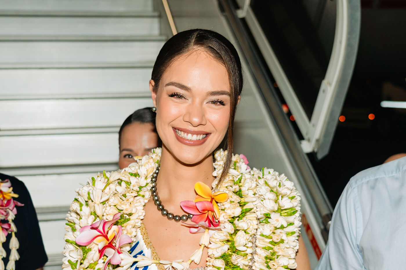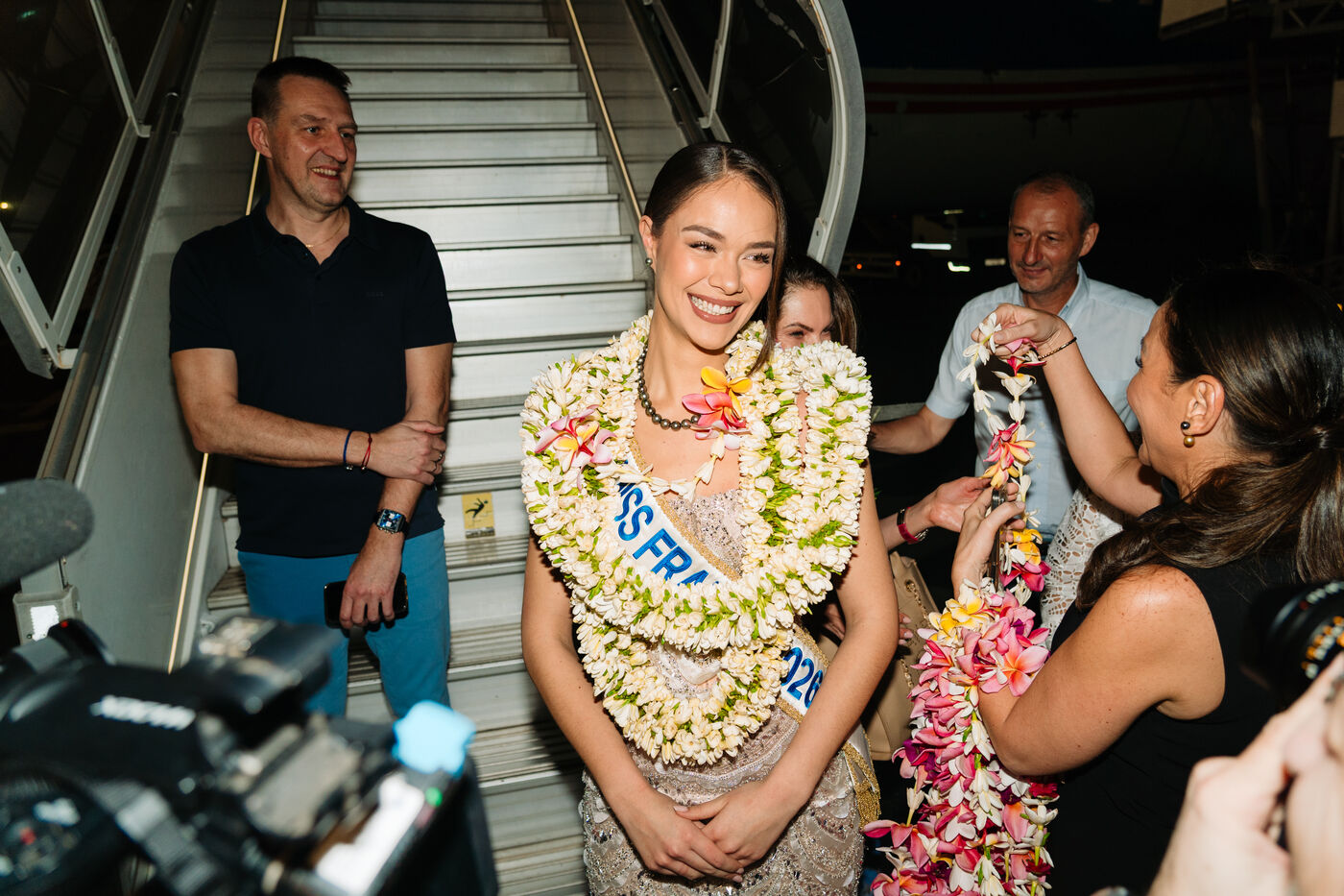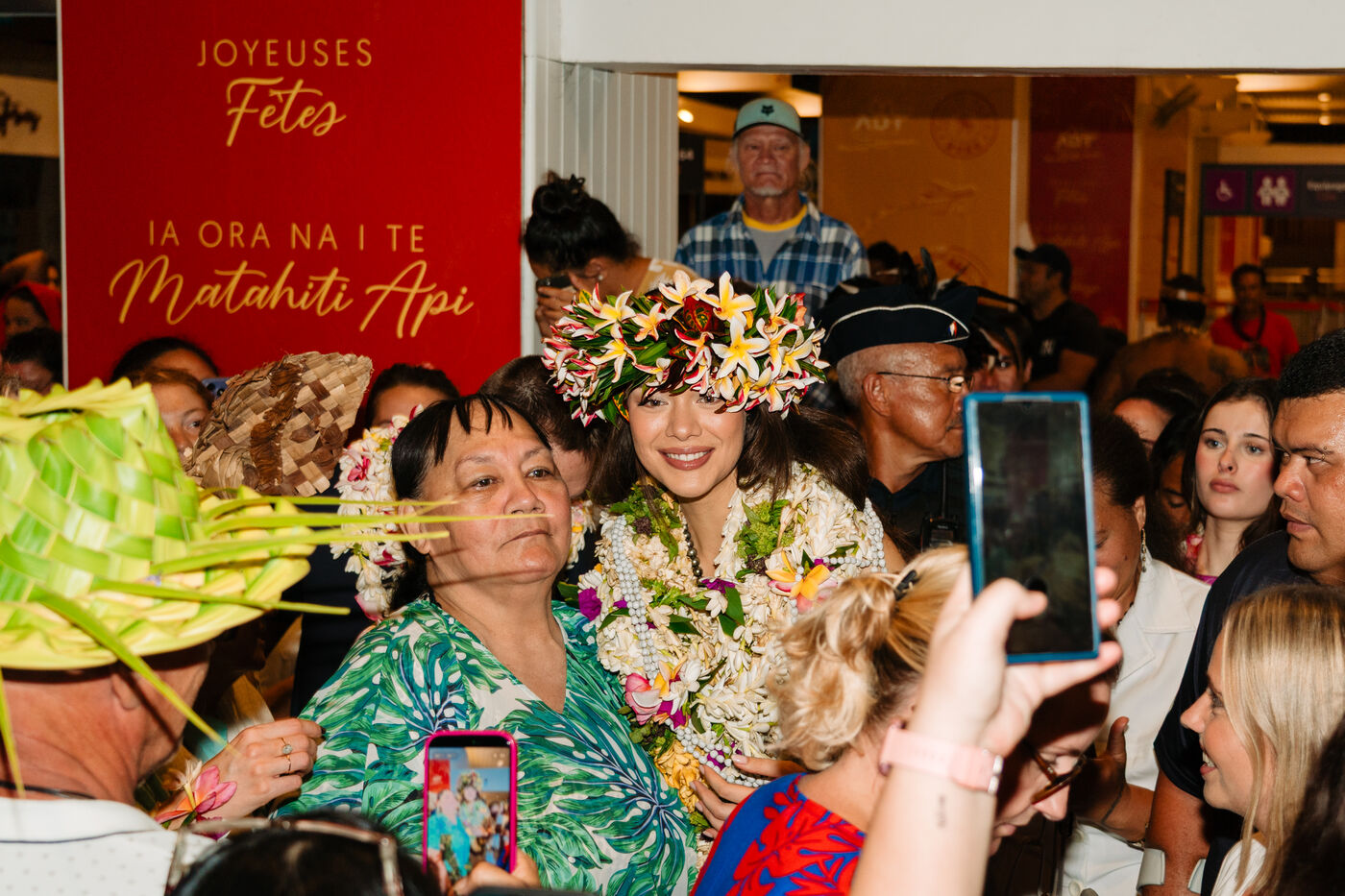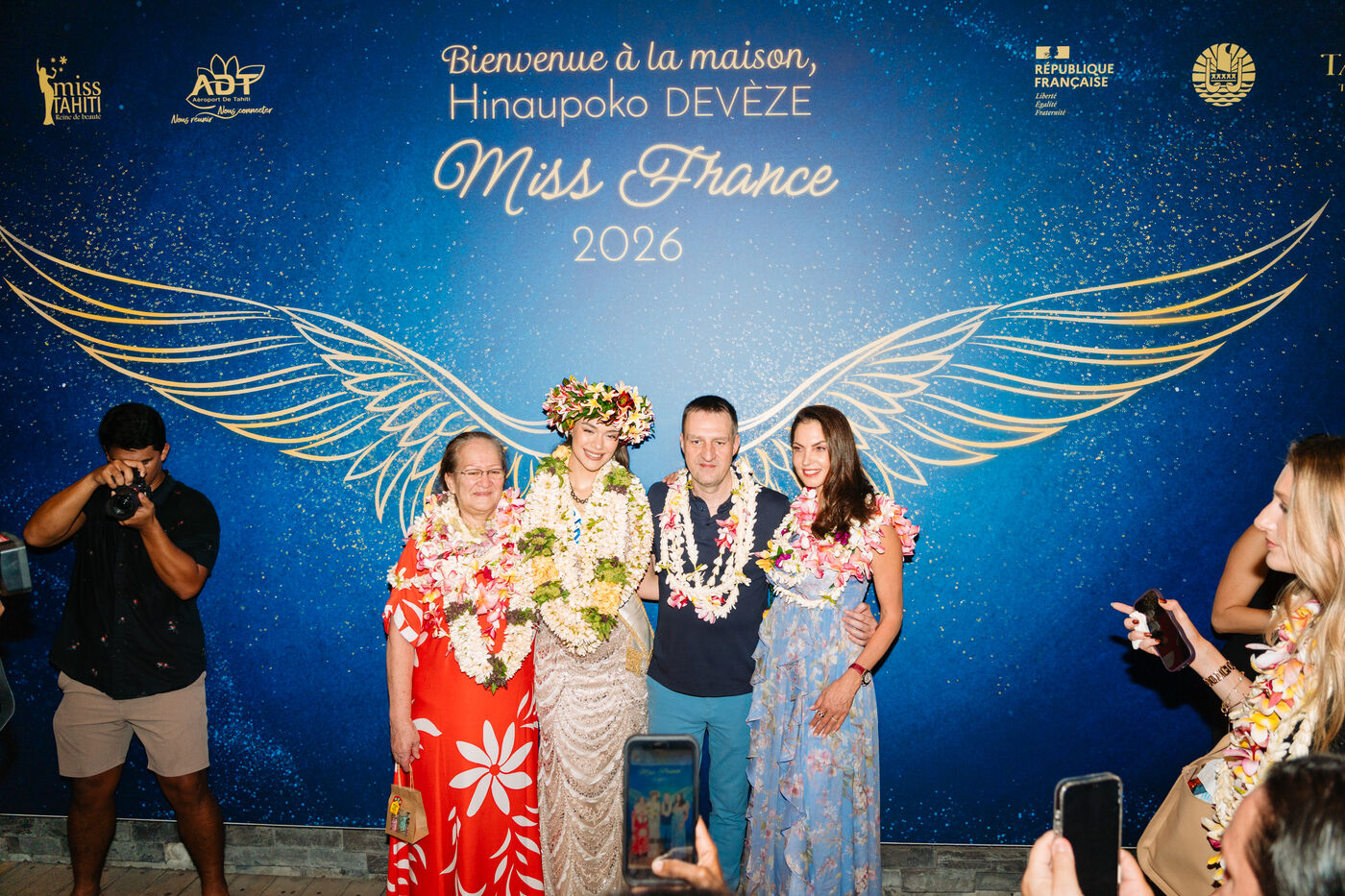 Hinaupoko Devèze, Miss Tahiti 2025 and Miss France 2026, arrives in Tahiti for the first time since her crowning. She is welcomed by local authorities, a Marquesan song and dance performance, and a large crowd.