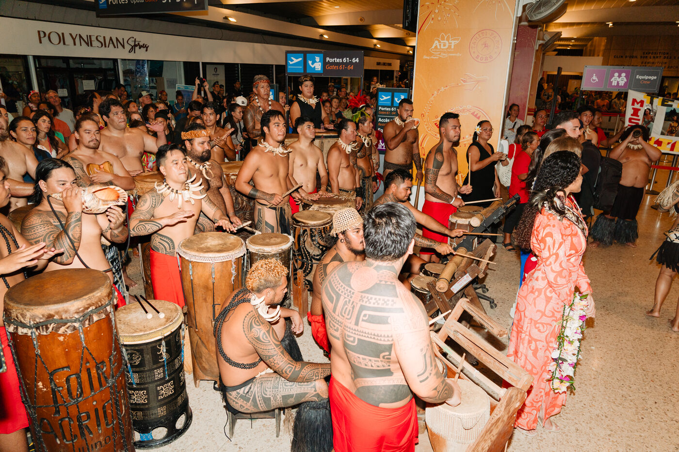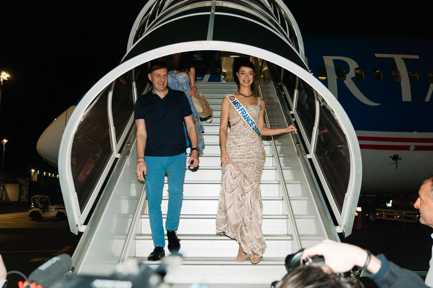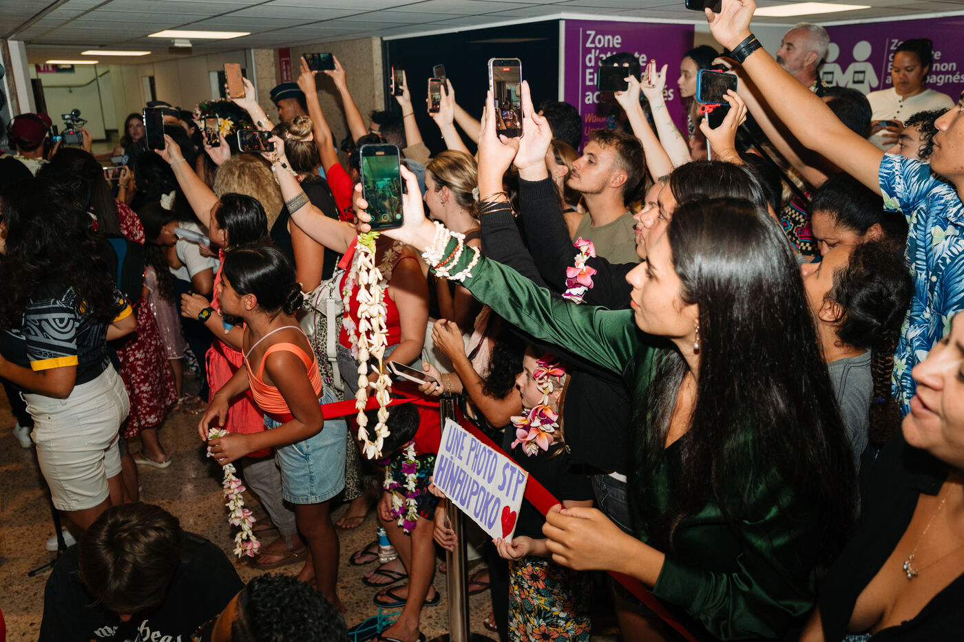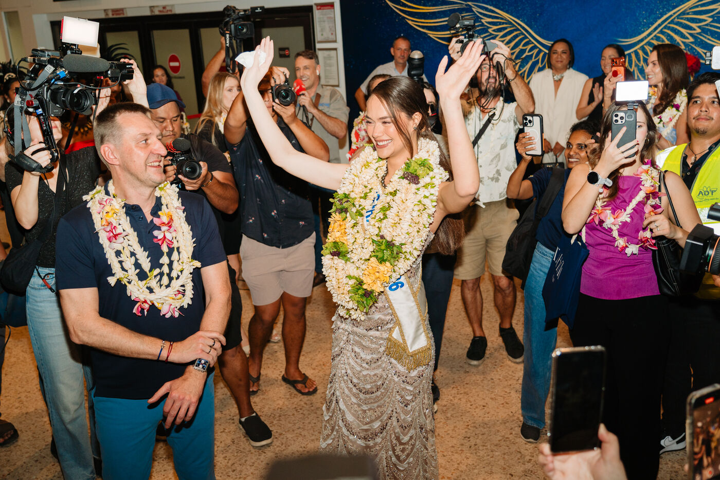 Hinaupoko Devèze, Miss Tahiti 2025 and Miss France 2026, arrives in Tahiti for the first time since her crowning. She is welcomed by local authorities, a Marquesan song and dance performance, and a large crowd.