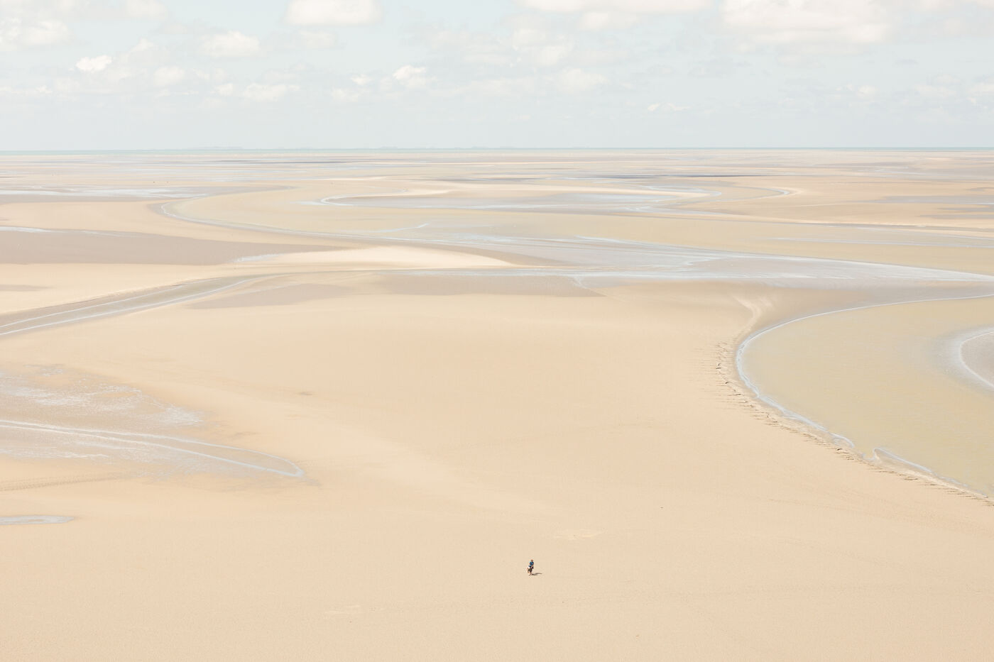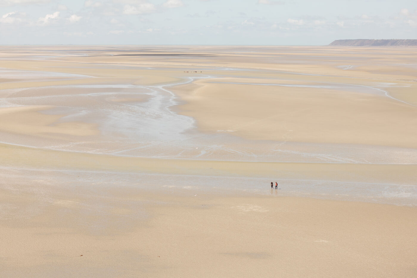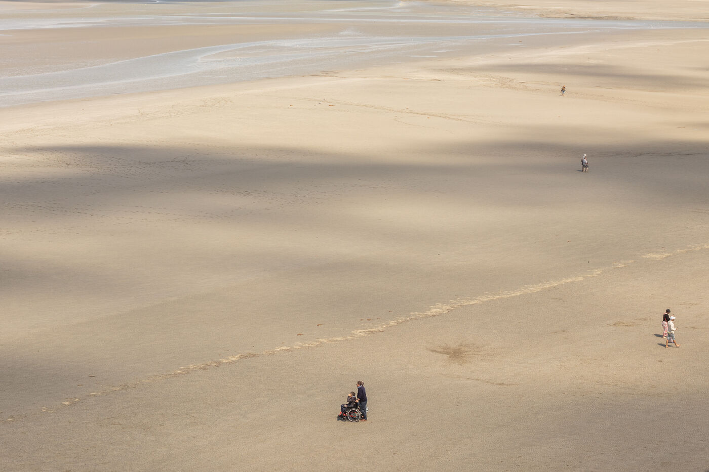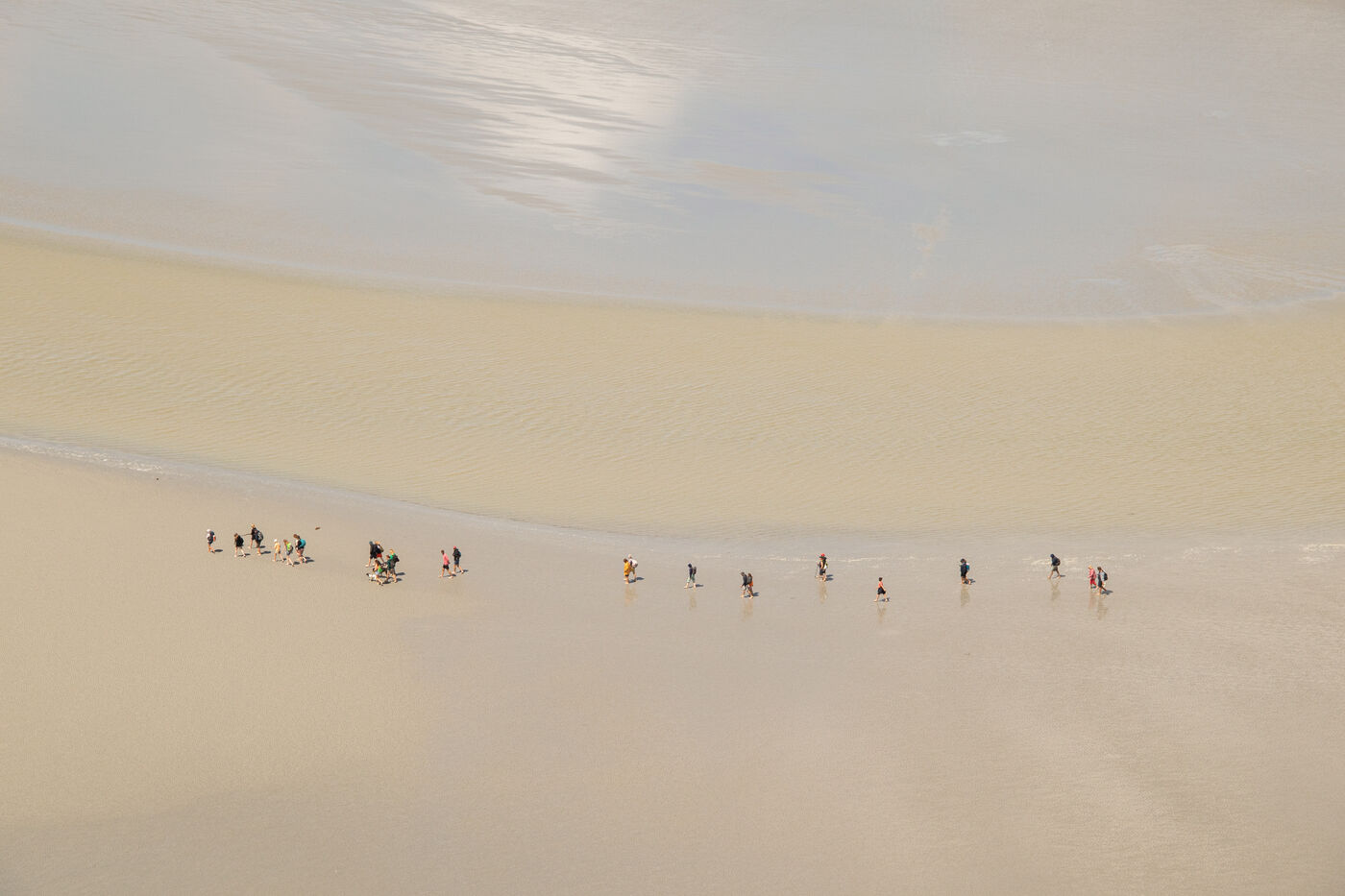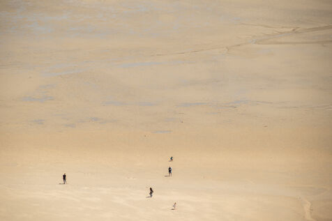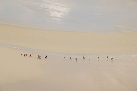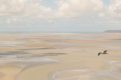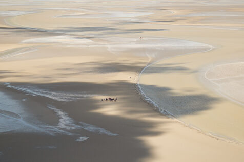 Autour de l'étendue sablonneuse du Mont-Saint-Michel, à mesure que la mer se retire, les humains errent, s'attardent, observent. Ils forment des cercles, comme s'ils participaient à un rituel éphémère. Sur cette bande de sable, chaque jour, nous vivons un moment de liberté exploratrice. Puis la mer revient, et tout retrouve le rythme de la nature. Les gens qui foulent ce territoire suivent la cadence naturelle, traversant simplement ce lieu.