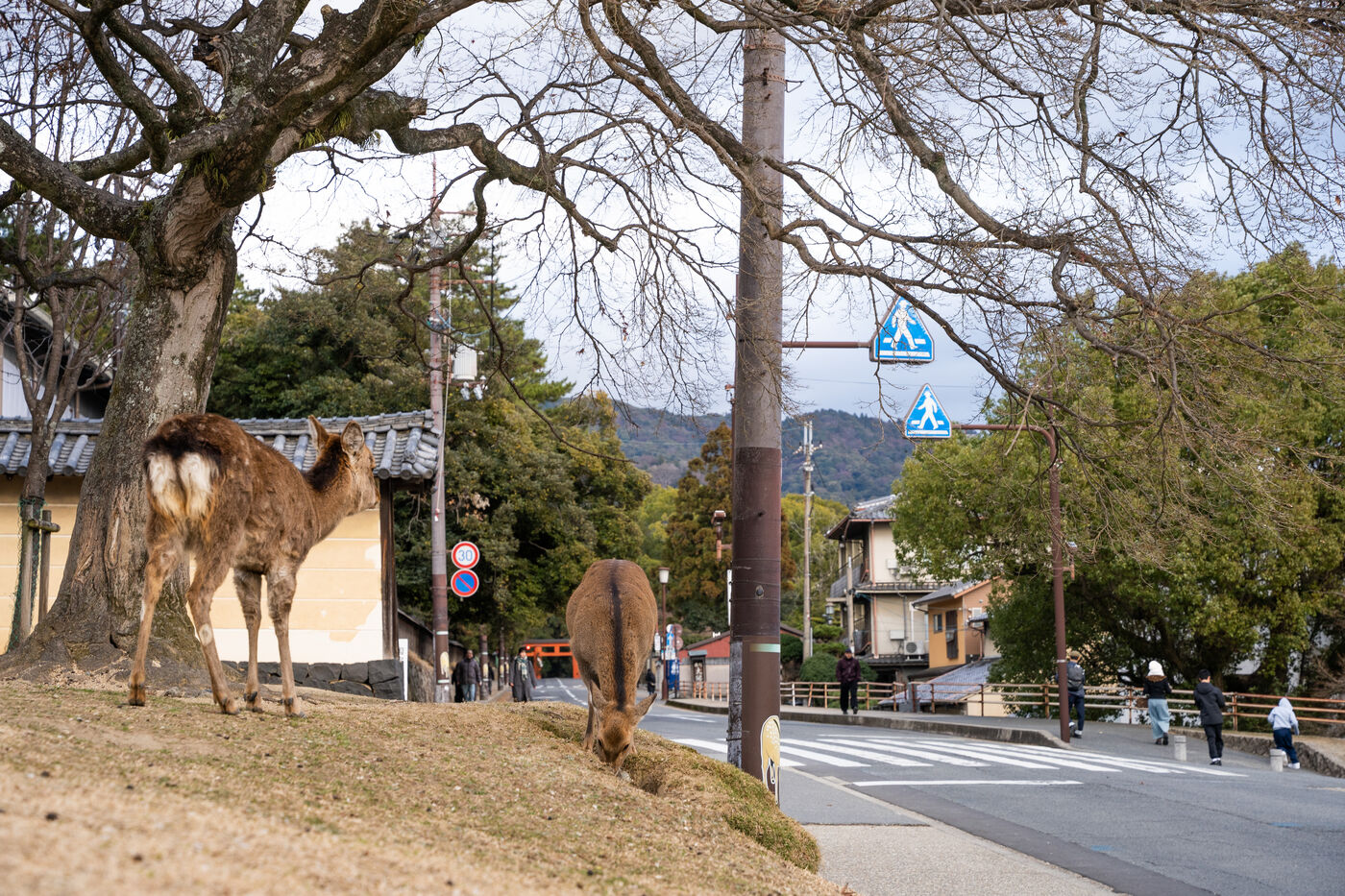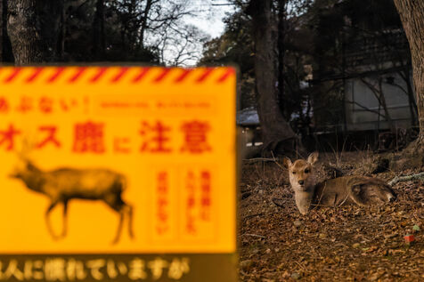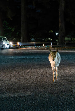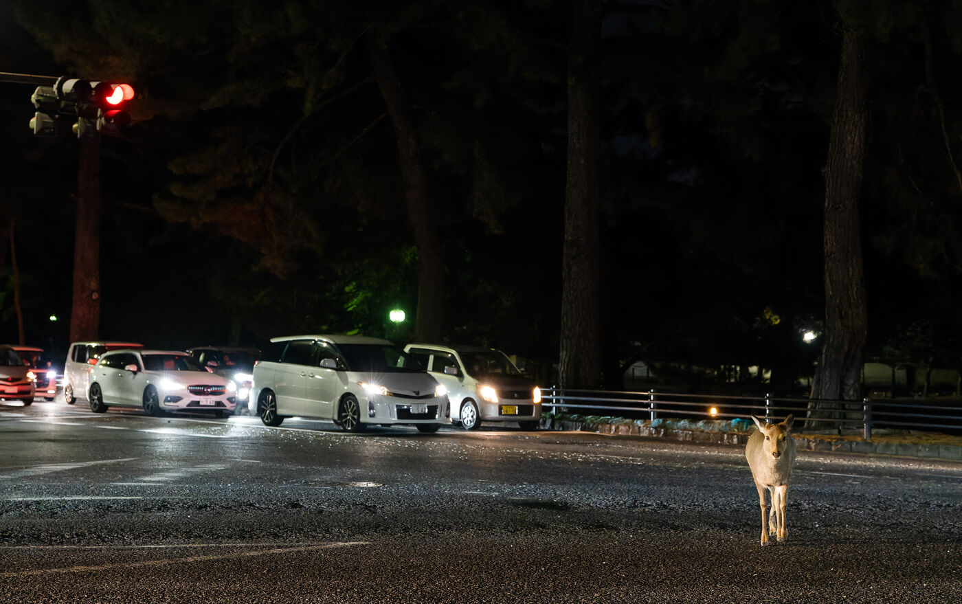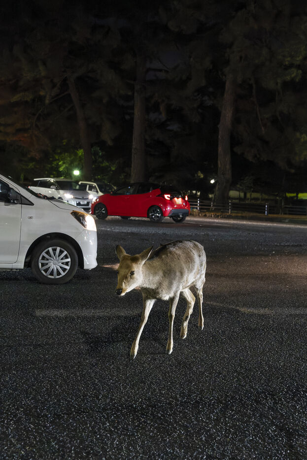 À Nara, les daims sauvages ne vivent pas seulement dans le parc, ils font désormais partie du paysage quotidien de la ville et de son image touristique. La coexistence entre environ 1 300 daims et près de 13 millions de visiteurs par an s’accompagne aussi de dégâts agricoles, de tensions avec les habitants, d’une pression sur l’habitat et de difficultés de gestion. Ces dernières années, les accidents ont de nouveau augmenté, en lien avec les contacts excessifs, l’alimentation inadaptée et la présence des daims aux abords des routes. Cette série propose avant tout un aperçu fragmentaire de la présence quotidienne des daims dans le paysage urbain.