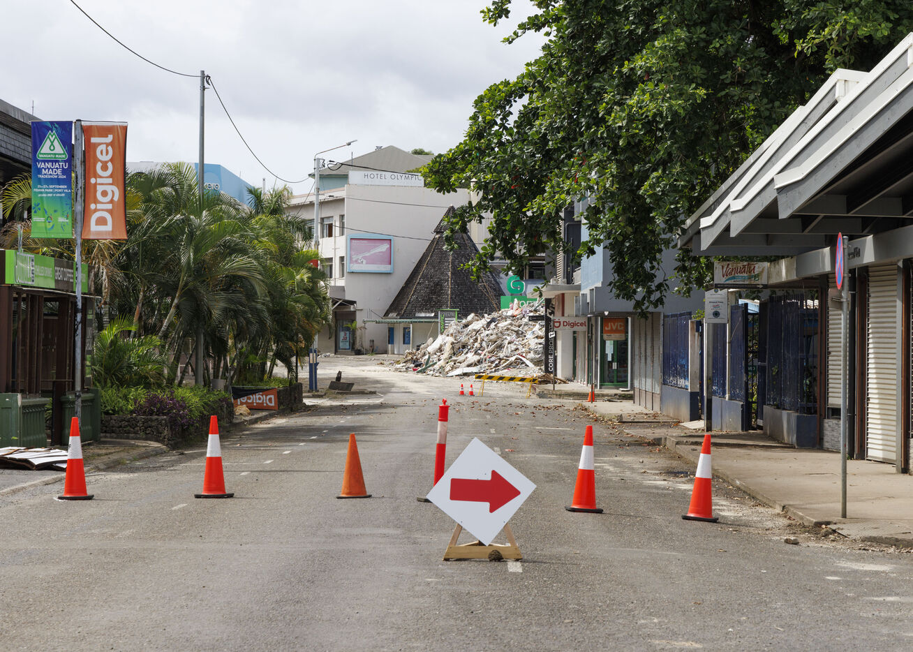 Fin janvier soit six semaines après le séisme, le risque d'effondrement est encore tel qu'à Port Vila, le quartier des affaires reste bouclé. Il est interdit de circuler à l'intérieur de la « zone rouge », aussi bien à pied qu'en véhicule, sans le pass remis par les autorités. Des bâtiments fragilisés menacent encore de s'écrouler. Une centaine a été déclarée sans risque, mais certains doivent être démolis comme le Lolam building, l'hôtel Chantilly's sur le front de mer ou des ambassades de France, des Etats-Unis et de la Nouvelle-Zélande dont le célèbre immeuble La Casa D’Andrea e Luciano n’est qu’un amas de béton.