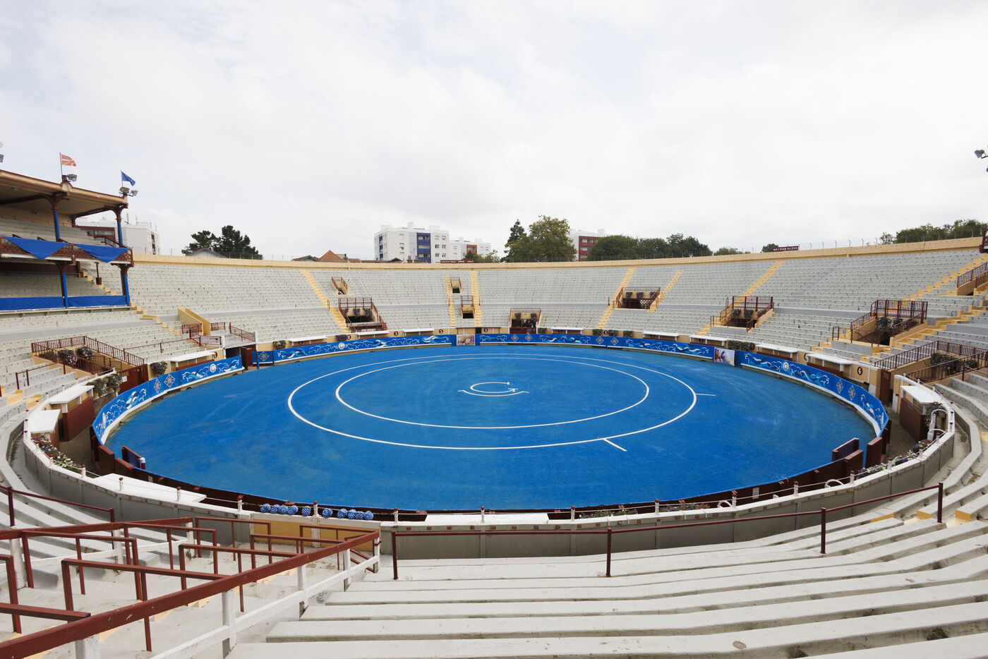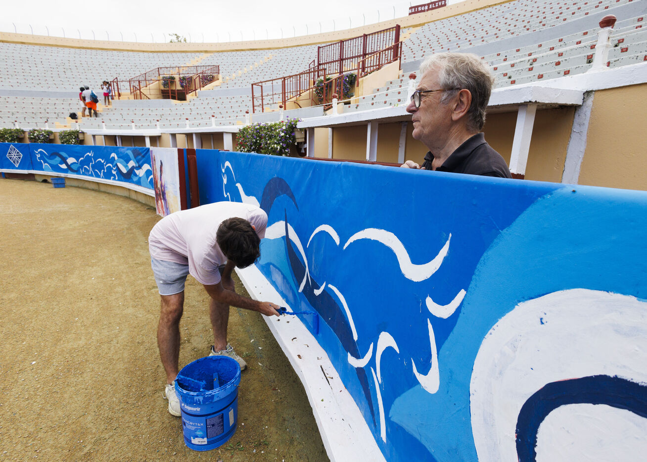 En ce mois d’août 2024, les arènes de Bayonne se transforment pour accueillir la corrida goyesque de l’année. Sont à découvrir quatre séries photographiques. Une première ses consacre aux préparatifs des arènes. Le décorum est posé : habituellement en rouge, le ruedo (la piste) vire au bleu sous le pinceau du peintre Miguel Etxeberria. L’artiste Pierre Saüt se charge des 120 mètres de toile à peindre pour recouvrir la totalité des talanquères (barrières) des arènes. Une seconde série présente les coulisses (écurie, la chapelle, le paséo…).