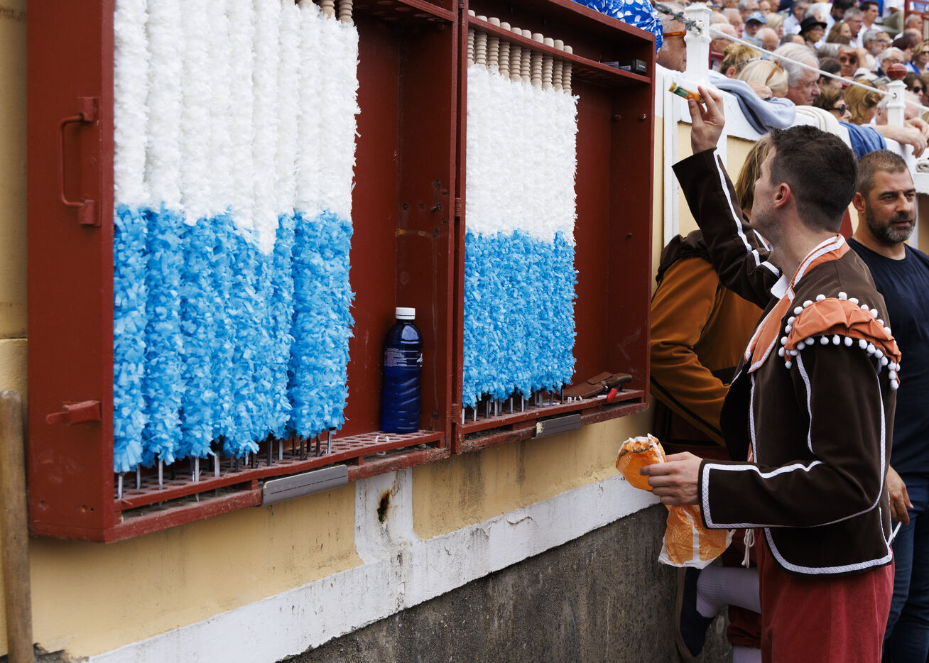 En ce mois d’août 2024, les arènes de Bayonne se transforment pour accueillir la corrida goyesque de l’année. Sont à découvrir quatre séries photographiques. Une première ses consacre aux préparatifs des arènes. Le décorum est posé : habituellement en rouge, le ruedo (la piste) vire au bleu sous le pinceau du peintre Miguel Etxeberria. L’artiste Pierre Saüt se charge des 120 mètres de toile à peindre pour recouvrir la totalité des talanquères (barrières) des arènes. Une seconde série présente les coulisses (écurie, la chapelle, le paséo…).