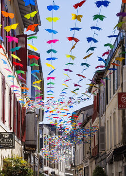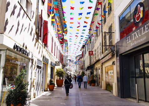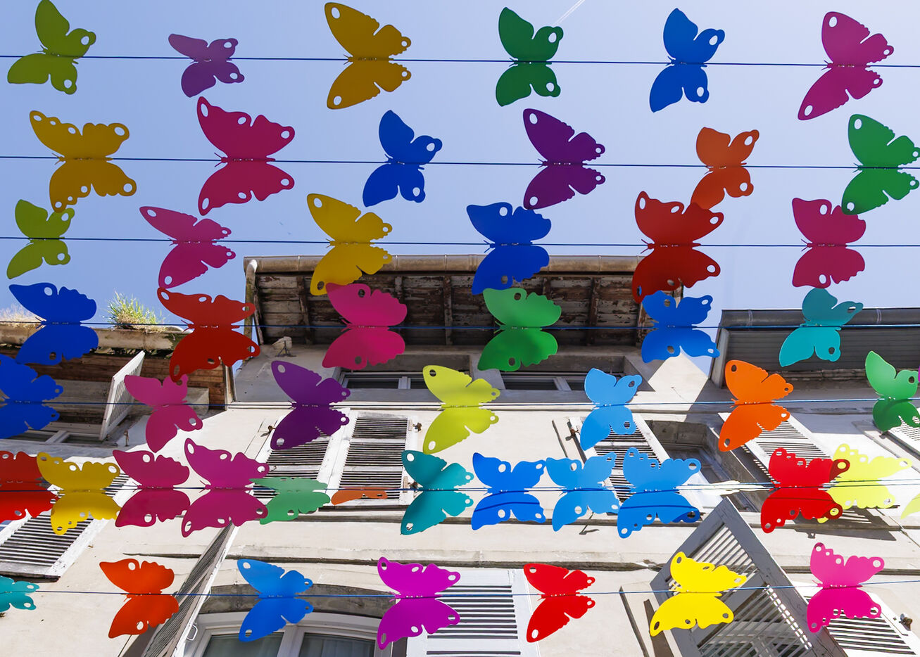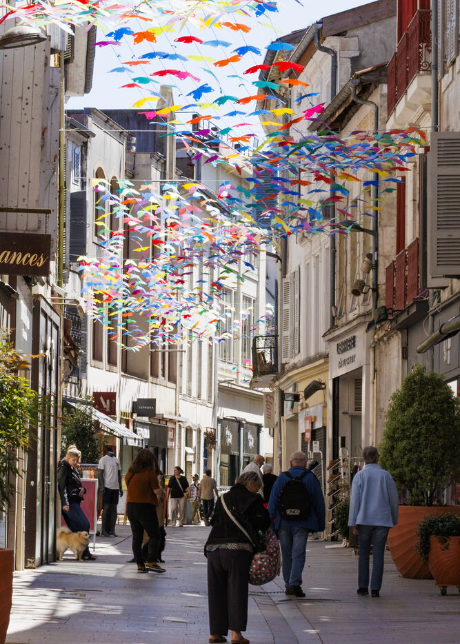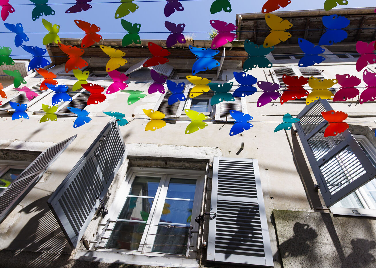 Ce dispositif d’ombrage éphémère est monté sur des câbles, fixé sur les façades, et sur lesquels sont disposés des lamelles flottantes en PVC qui prennent différentes formes (fleurs, papillon ou autres). La ville landaise a opté pour des papillons pour amener un peu de fraicheur aux marcheurs et faire baisser la température lors des fortes chaleurs de l’été.