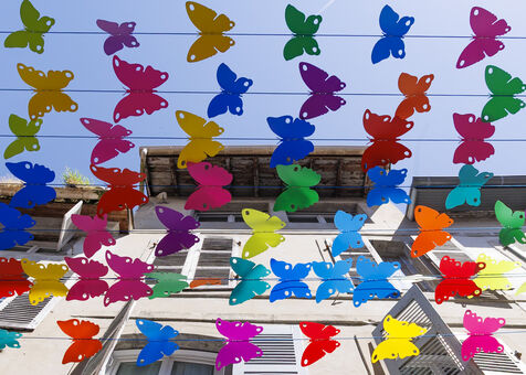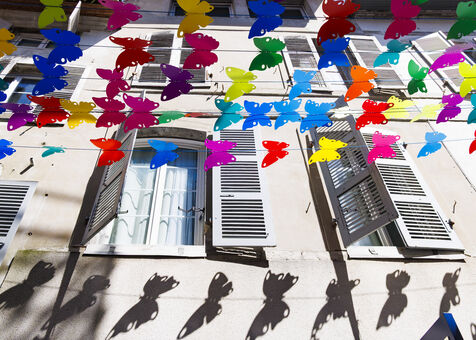 This temporary shade structure is mounted on cables attached to building facades, with floating PVC slats arranged in various shapes (flowers, butterflies, etc.). The town in the Landes region opted for butterflies to bring a little coolness to walkers and lower the temperature during the hot summer months.