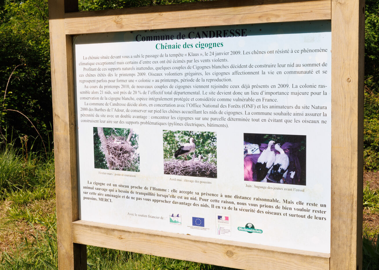 Dans le coeur des Landes, les Barthes de l’Adour présentent un milieu naturel et protégé spécifique de cette région du sud ouest de la France, composé par des terres agricoles inondables en période de crue du fleuve de l’Adour. Un paysage de prairies marécageuses s’étale et représente un véritable garde manger pour toute une faune et notamment les cigognes qui se sont installées quasiment à l’année. Sur la route menant à Saint-Vincent de Paul, sur la commune de Candresse, une chênaie a subi le passage de la tempête Klaus de janvier 2009 et certains chênes n’ont pas résisté aux vents violents, mais sont restés sur pied permettant alors aux cigognes de construire leur nid au sommet des arbres entêtés. Aujourd’hui, une colonie rassemble plus de 20 nids, soit près de 20% de l’effectif total départemental.