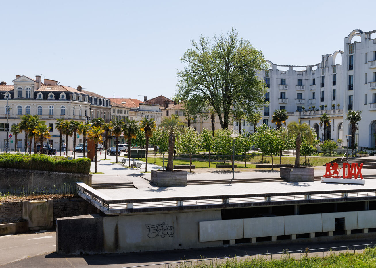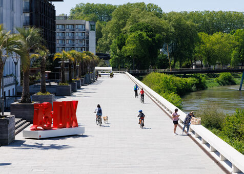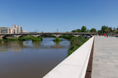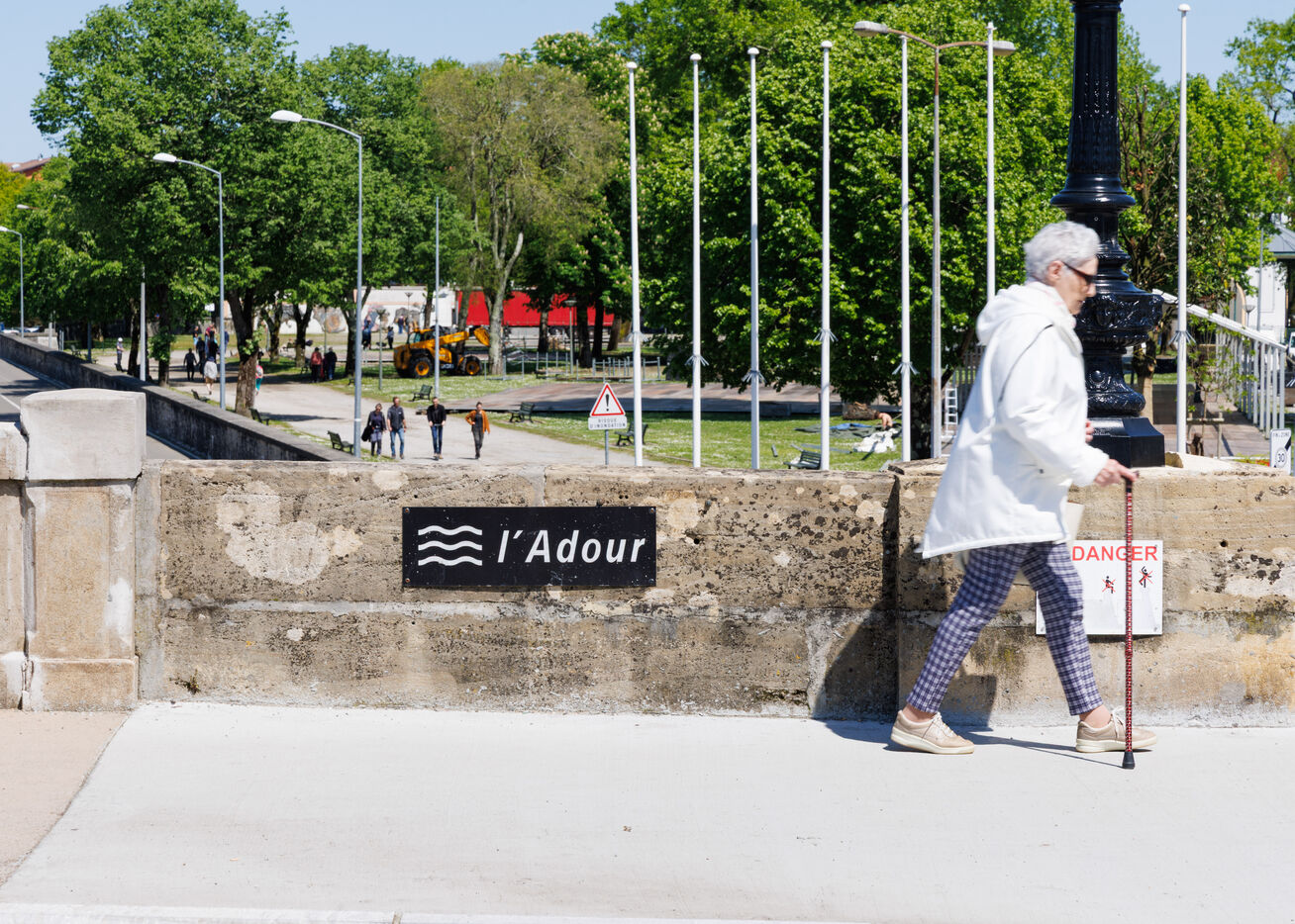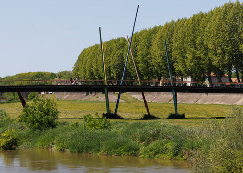 The Adour is a river in the Aquitaine Basin in south-western France, over 300 km long, which rises in the Pyrenees near the Pic du Midi de Bigorre and flows into the Atlantic Ocean between Tarnos and Anglet. The Adour flows through several towns, including Dax, which takes advantage of its presence to offer a 500-metre-long promenade combining the town centre and nature. The banks of the Amour in Dax were originally dedicated to economic activity, and were known as the Promenade des Baignots. Then the left bank, on the town centre side, lost its economic activity and was transformed into a space known as the Balcons de l'Adour, with a grassy area serving as a beach in summer and a place to relax by the water. A 170-metre wooden footbridge with colourful masts provides a pedestrian link between the two banks, while the Pont Vieux bridge is used by cars. The Balcons de l'Adour welcomes both pedestrians and cyclists.