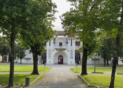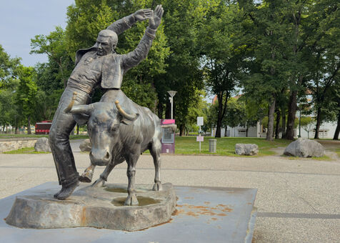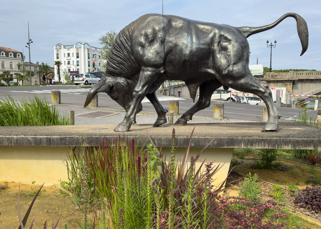 Between the Adour River and the Gallo-Roman ramparts in Dax lies the Parc Théodore Denis, a public garden also known as the “Parc des Arènes de Dax.” On the Pont Vieux side is the main entrance, featuring an impressive sculpture of a bull made from lost wax by Saint-Étienne sculptor Christian Maas, installed in 2000. As you walk down the path, you will see the coat of arms of Dax, featuring a tower to evoke the Roman period and a lion/leopard symbolizing the English occupation, with two other metal statues of a bullfighter with his cape right next to it. The garden features a 19th-century bandstand surrounded by sweetgum trees, just opposite the main entrance to the bullring, with a superb sculpture of a bull's head above the door. To the right of the Andalusian-style building, constructed in 1913 and listed as a Historic Monument since 2013, towards the Bains Saint Pierre, a sculpture pays tribute to the greatest racing cow of the 20th century (Fédérale), depicted with a spacer in the traditional figure of the Landes race: the écart. This sculpture is also the work of sculptor Christian Maas.
