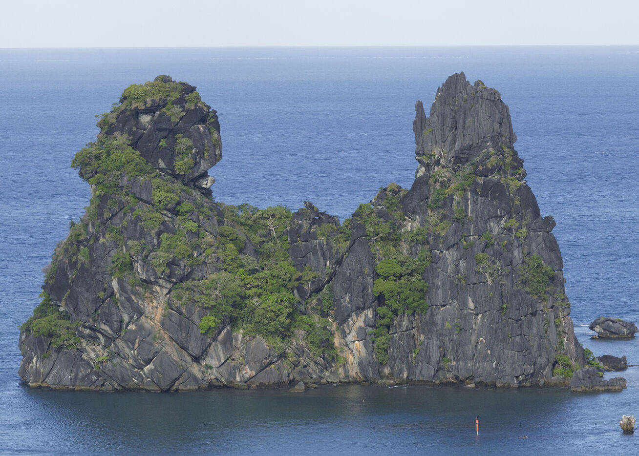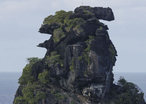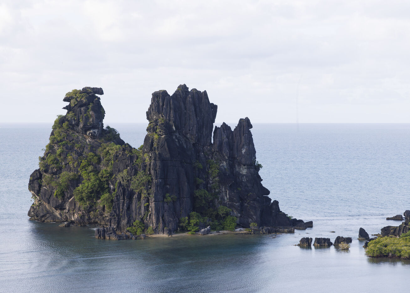 The town in the northeast is renowned for its black limestone cliffs rising out of the mountains, wedged between the green of the lush vegetation and the blue of the Pacific Ocean. Whether they have specific shapes, such as the most famous ones reminiscent of a brooding hen or, opposite it, a sphinx. Whether they are elongated, as depicted on the 5,000 Pacific franc Caledonian banknote, the cliffs of Lindéralique are weathered by time but still impressive. All the more so when you move away from them by sea to reach the islet of Hiengabat with its panoramic view of Hienghène Bay and its natural splendors. Geologically speaking, the rocks of Lindéralique are a karstic limestone massif dating from the Eocene epoch (-53 to -34 million years ago) with a relief typical of limestone regions, resulting from the action of water, which dissolves the rock and leads to the formation of caves, sinkholes, dolines, etc.