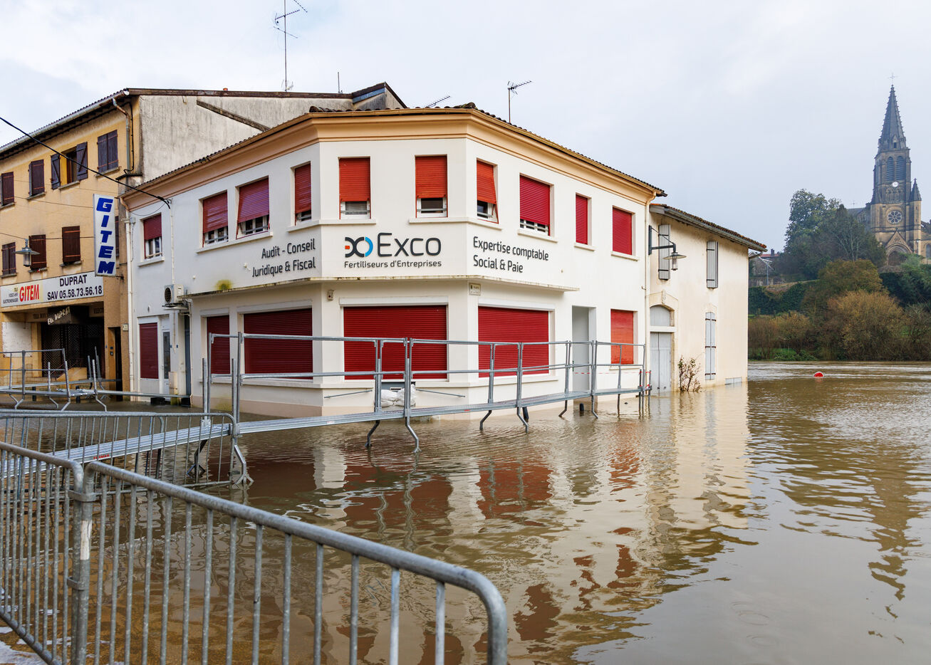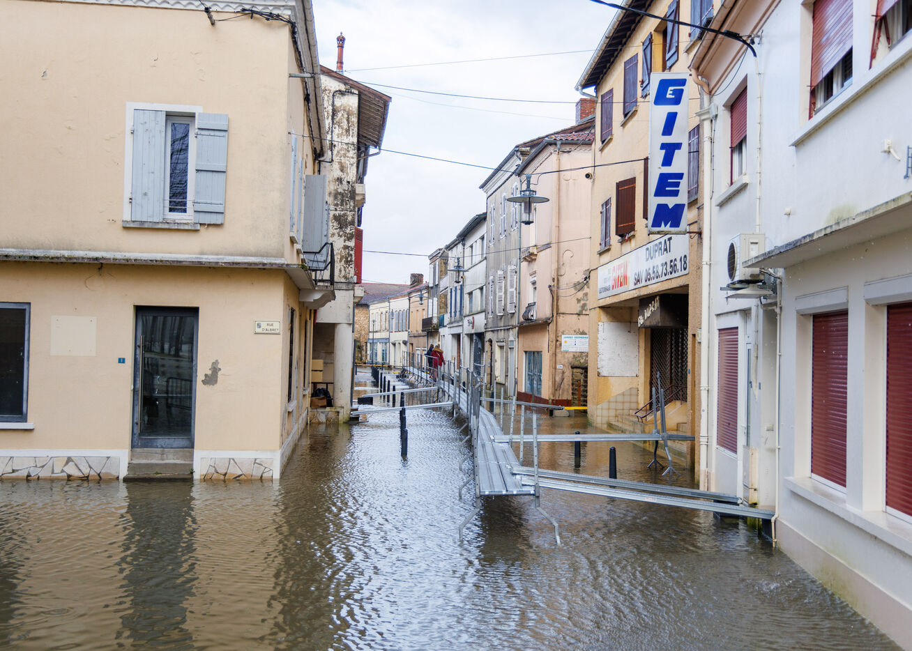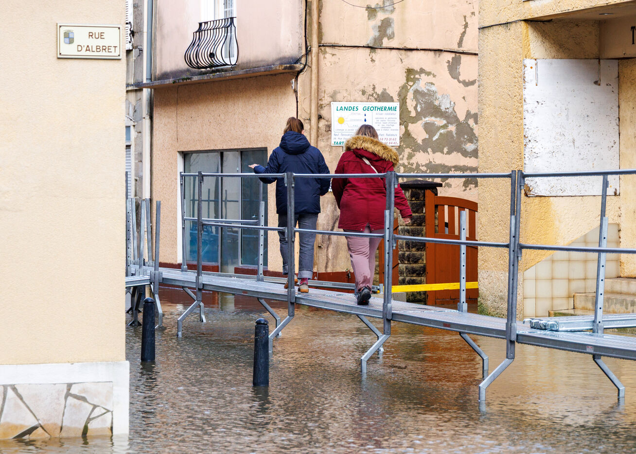 For over a week now, Tartas, a town in the Landes department in the south-west of the Nouvelle-Aquitaine region with a population of just over 3,000, has been dealing with the aftermath of Storm Nils, followed by Storm Pedro and the flooding of the Midouze River. This right tributary of the Adour river originates in Mont-de-Marsan, at the confluence of the Midou (or Midour) and the Douze, before flowing northwest and joining the Adour at Hourquet, not far from Tartas. The small streets along the Midouze are now equipped with flood-proof paths. In Tartas, you can literally walk on water.