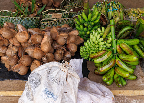 At the Luganville market, on the island of Espiritu Santo in the Vanuatu archipelago, life is organized simply under an open shelter, between concrete pillars and wooden tables. The stalls, arranged without artifice, present everyday products: green banana diets, coconuts piled up on the ground, tubers, vegetables and tropical fruits.