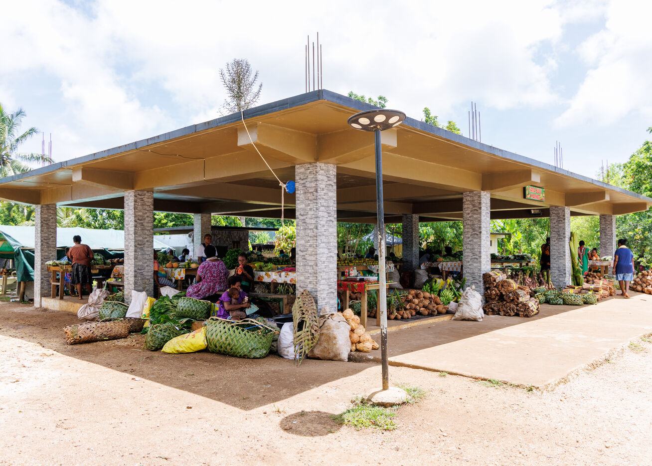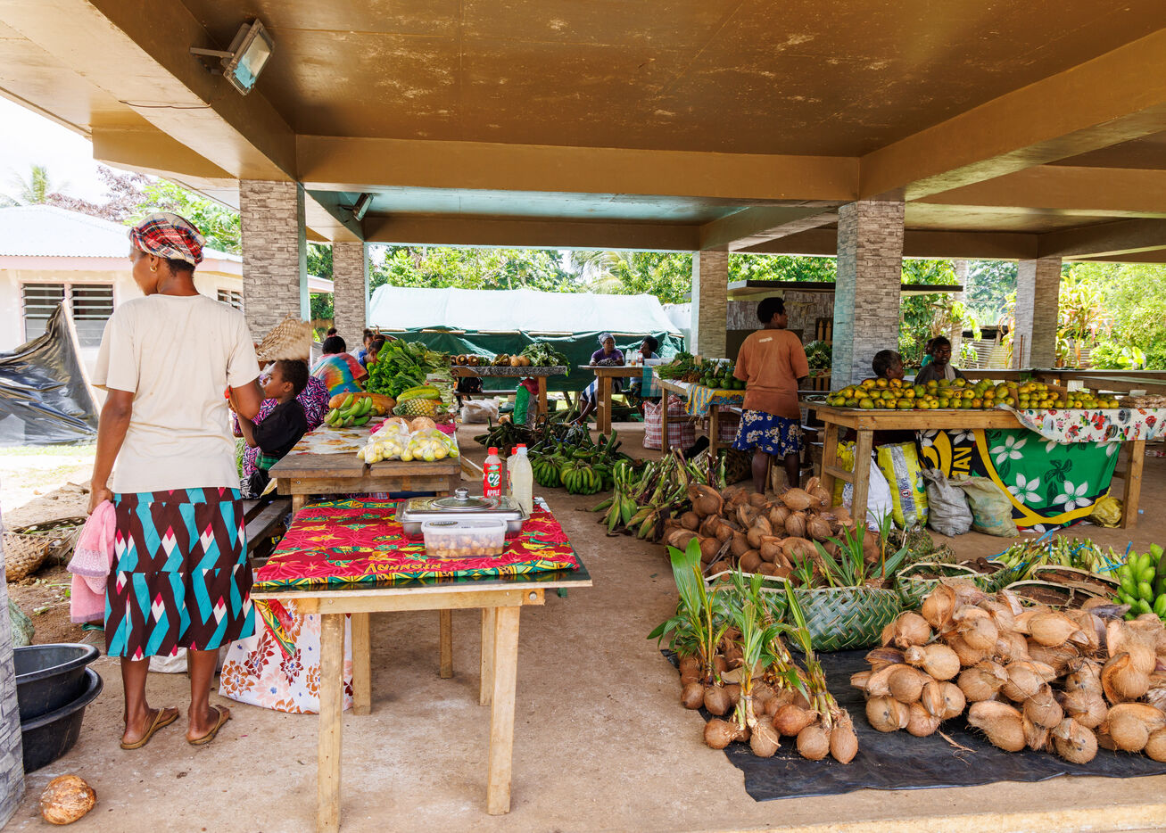 Au marché de Luganville, sur l’île d’Espiritu Santo dans l’archipel du Vanuatu, la vie s’organise simplement sous un abri ouvert, entre piliers de béton et tables en bois. Les étals, disposés sans artifice, présentent les produits du quotidien : régimes de bananes vertes, noix de coco entassées au sol, tubercules, légumes et fruits tropicaux.