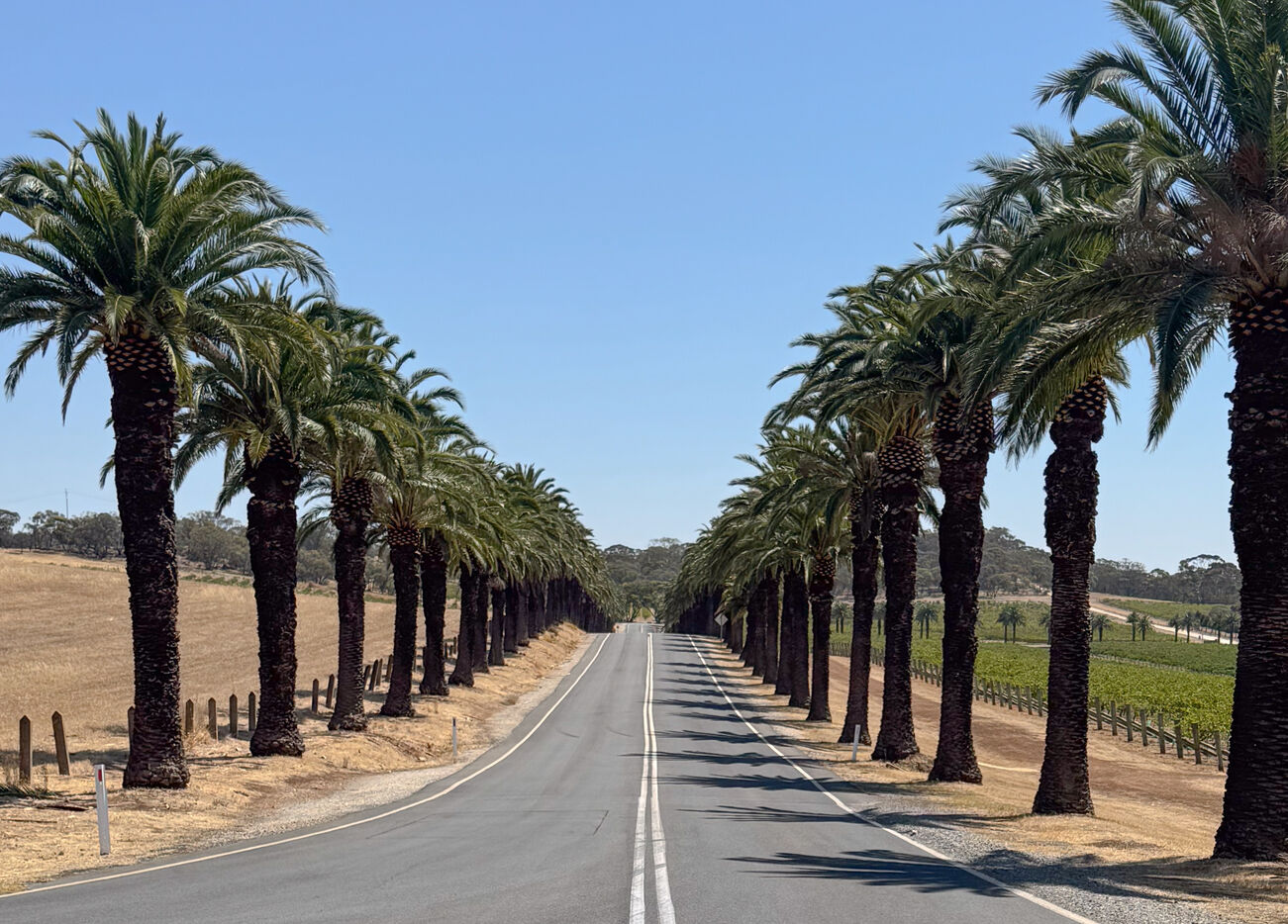 Dans la vallée du Barossa, Seppeltsfield Road trace une ligne presque parfaite à travers le paysage viticole. De part et d’autre, une double rangée de palmiers centenaires encadre la chaussée avec une rigueur quasi architecturale.