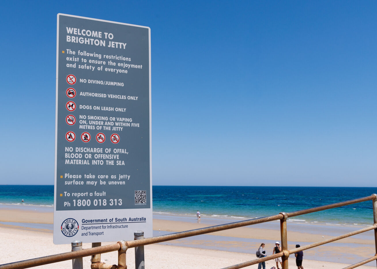 À Brighton Jetty, près d’Adelaide, le paysage balnéaire semble d’abord ouvert et paisible. Pourtant, dès l’entrée, une série d’interdictions rappelle que cet espace est strictement encadré.
