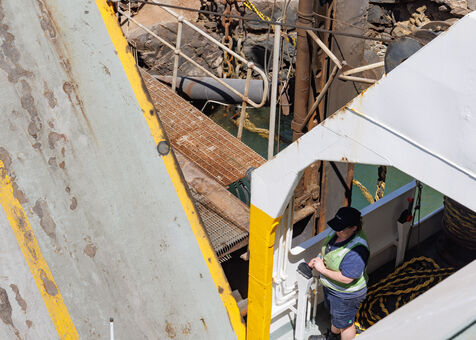 On board, passengers oscillate between waiting and contemplation. Some stay inside, others face the salty air on the bridge. The gaze is lost in an almost empty landscape, where only the water and sky lines remain. Time seems suspended, as if the crossing itself became a space apart.