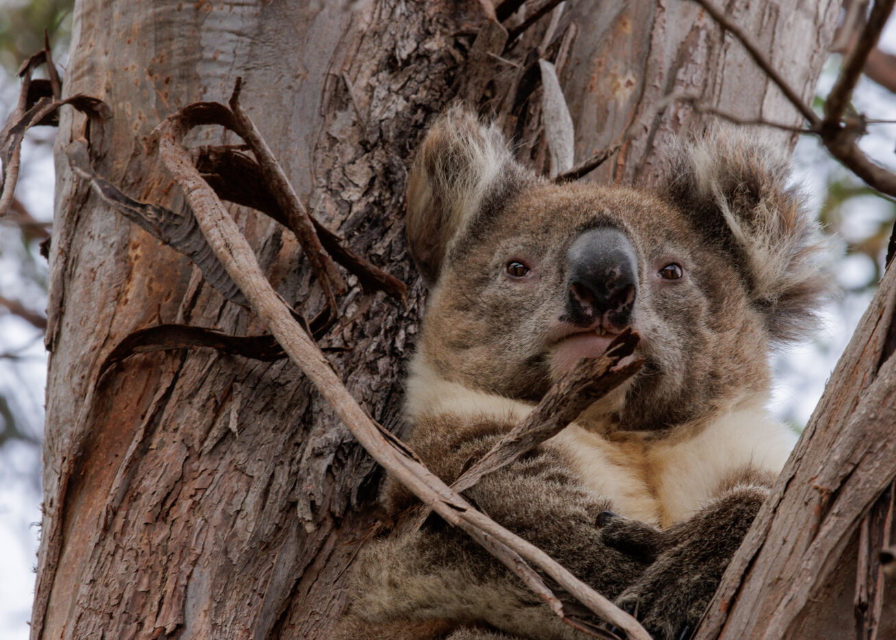 Sur la route menant à Seal Bay, à Kangaroo Island, les koalas font partie des observations régulières, à condition de lever les yeux. Perchés dans les eucalyptus, ces marsupiaux passent l’essentiel de la journée immobiles, dissimulés dans le feuillage.