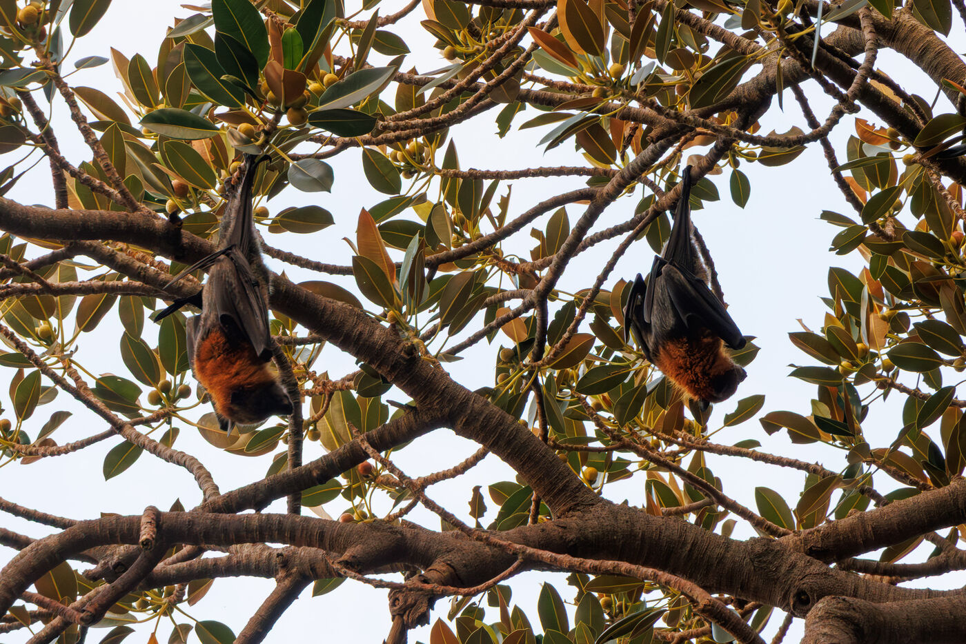 But beyond its prospects on the Sydney Opera House and the Sydney Harbour Bridge, the site is home to a spectacular animal presence: colonies of bats, these large frugivorous bats, visible in large numbers in the trees of the park. Suspended in clusters in the canopy, sometimes by the hundreds, they constitute a striking singularity of the place.