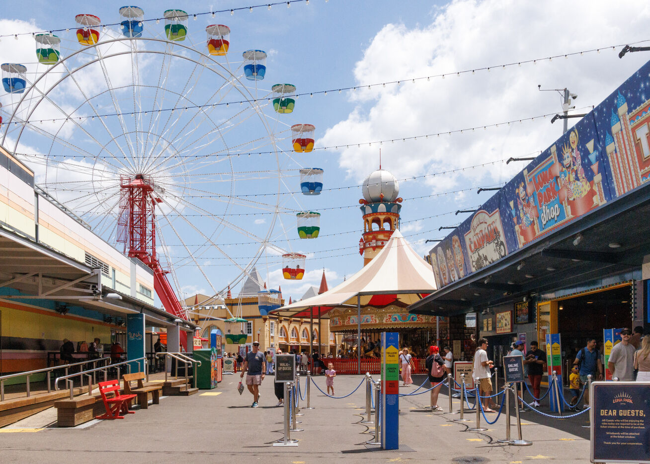 Free admission but paid activities, Luna Park retains a unique retro atmosphere, especially in its "Coney Island" section, where ancient-inspired mechanical games remain. Among its flagship facilities is the Scenic Railway, one of the oldest wooden roller coasters still in operation in the world.
