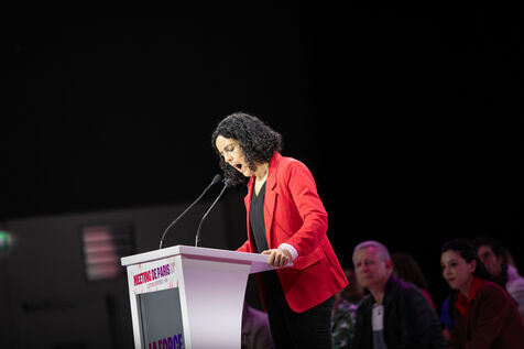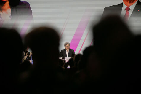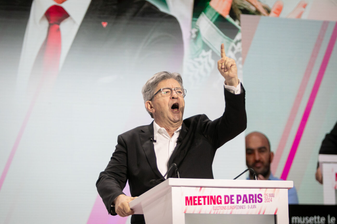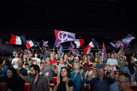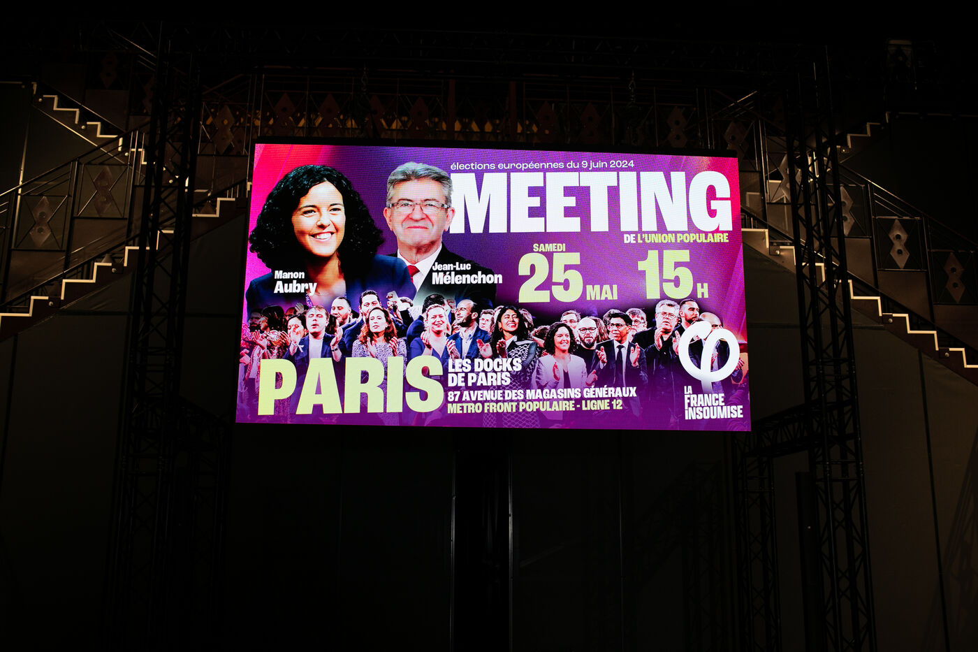 FRANCE, Paris May 25, 2024, Parisian meeting of the Union Populaire European election campaign with Manon Aubry and Jean Luc Mélenchon at the Dock Pullman des Docks de Paris.