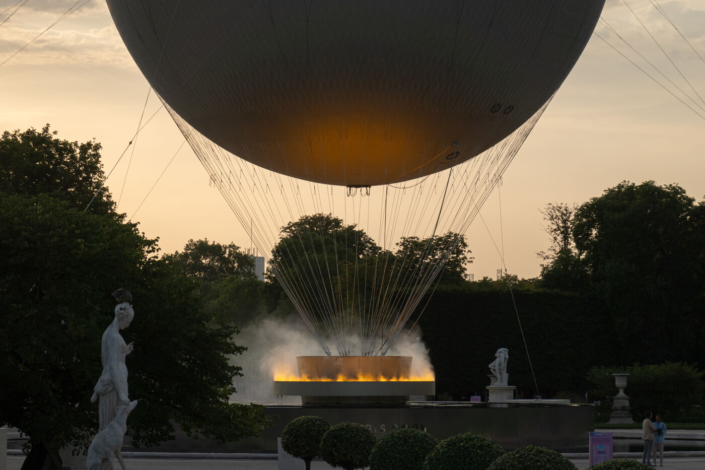 FRANCE, Paris, July 29, 2024, View of the hot-air balloon with the Olympic cauldron from the Tuileries Gardens. Photography by Victoria Valdivia Trigo / Hans Lucas.