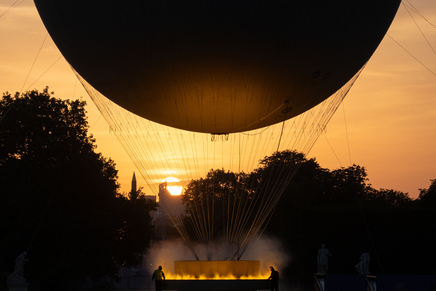 FRANCE, Paris, 29 juillet 2024, Vu du ballon montgolfière avec la vasque olympique depuis le jardin des Tuileries. Photographie par Victoria Valdivia Trigo / Hans Lucas.
