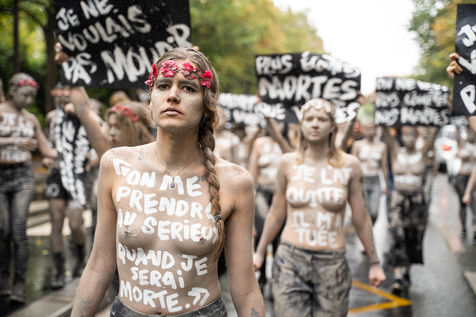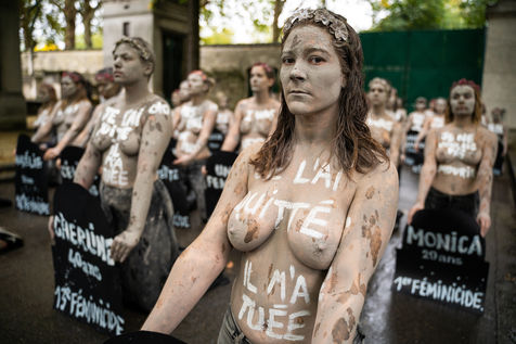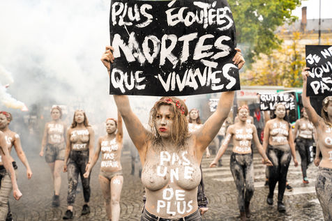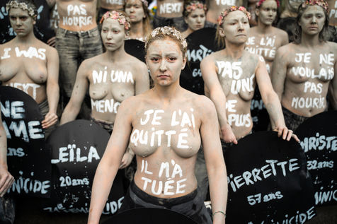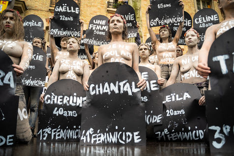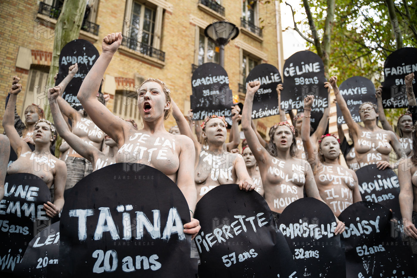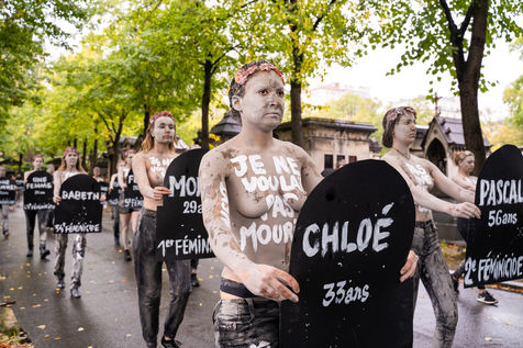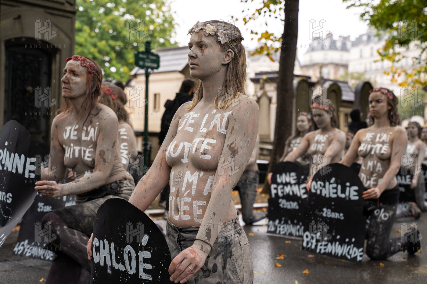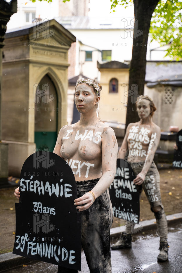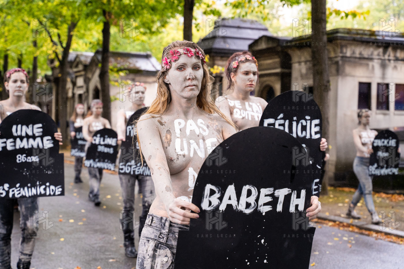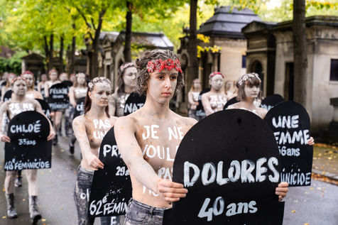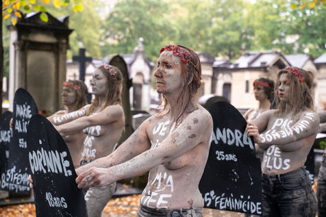 "Plus écoutées mortes que vivantes", dénonçaient les Femens, qui ont défilé dans le quartier puis dans le cimetière, où elles ont posé avec des stèles en références aux 114 femmes tuées par leur compagnon ou ex-compagnon depuis le début de l'année 2019.