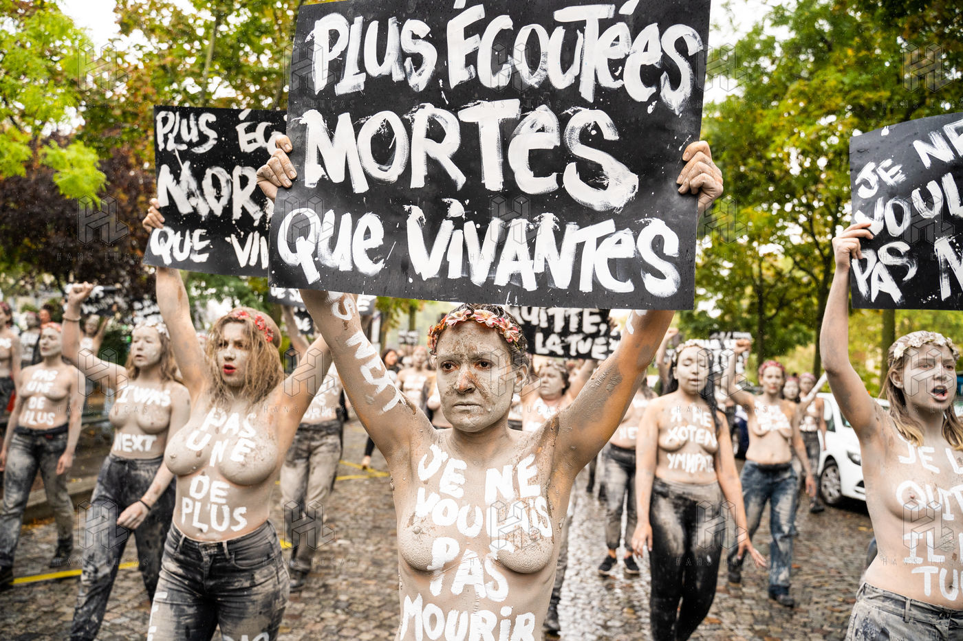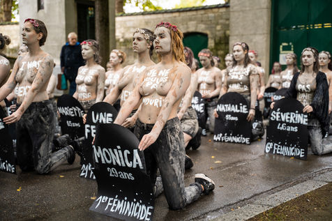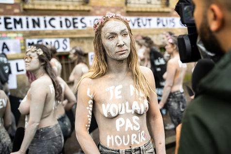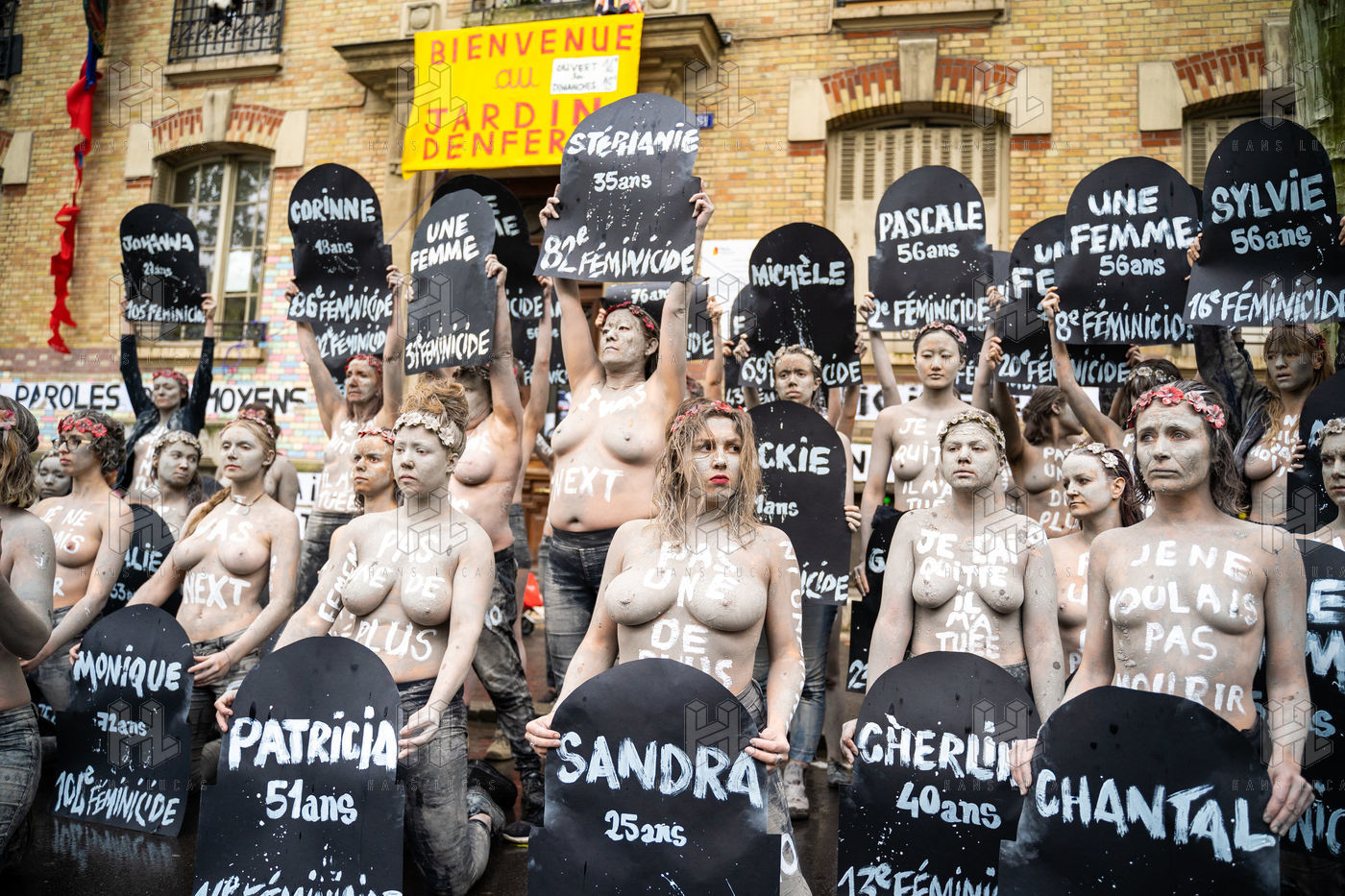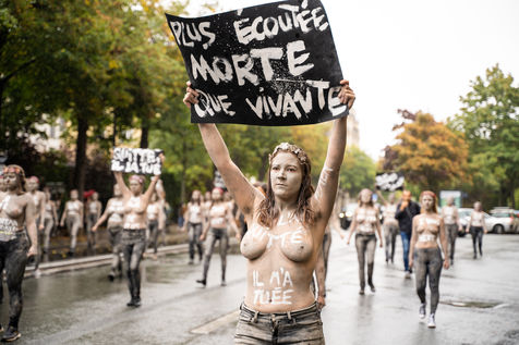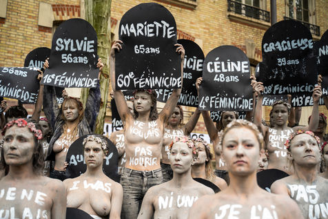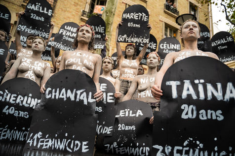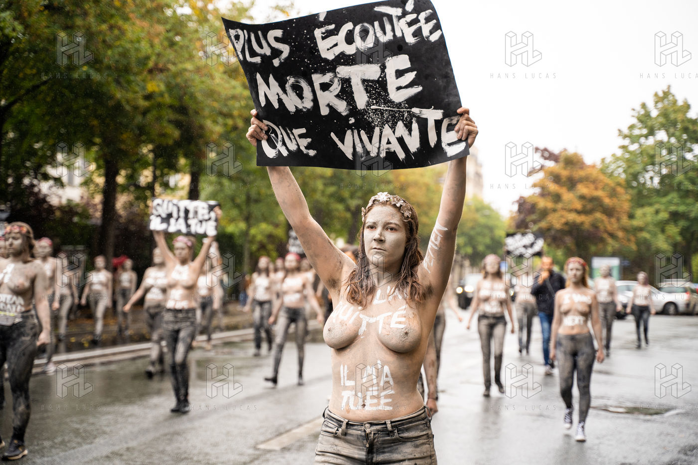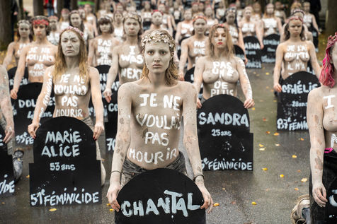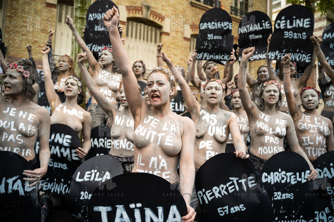 "Plus écoutées mortes que vivantes", dénonçaient les Femens, qui ont défilé dans le quartier puis dans le cimetière, où elles ont posé avec des stèles en références aux 114 femmes tuées par leur compagnon ou ex-compagnon depuis le début de l'année 2019.