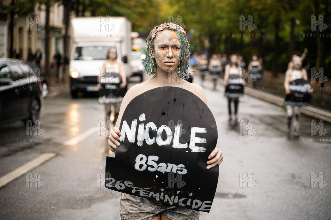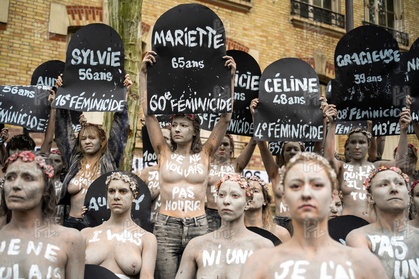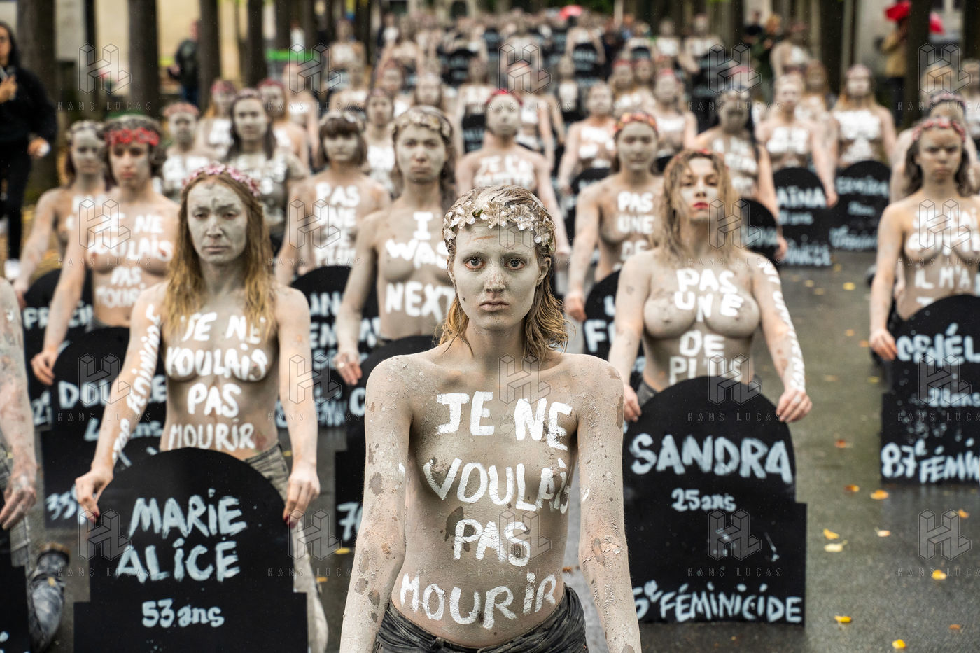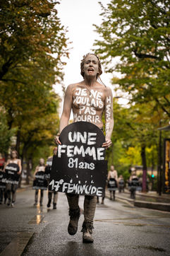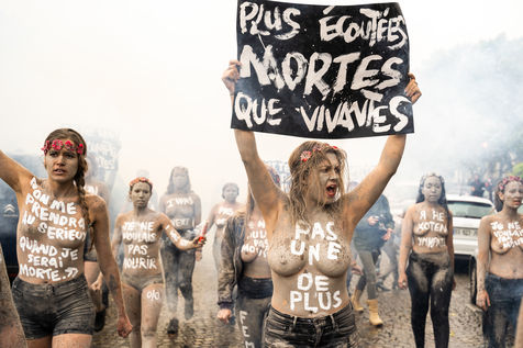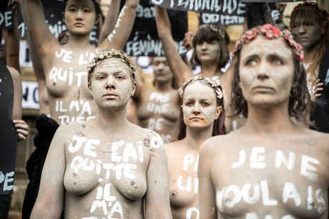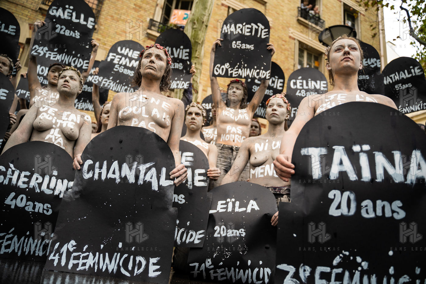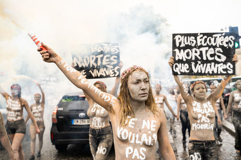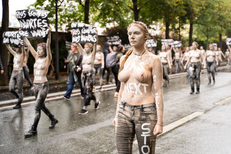 "Plus écoutées mortes que vivantes", dénonçaient les Femens, qui ont défilé dans le quartier puis dans le cimetière, où elles ont posé avec des stèles en références aux 114 femmes tuées par leur compagnon ou ex-compagnon depuis le début de l'année 2019.