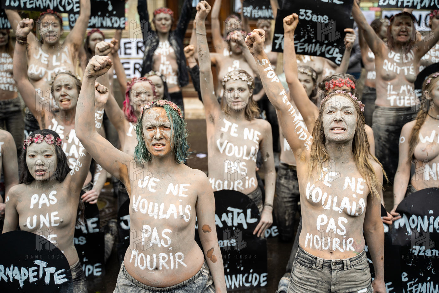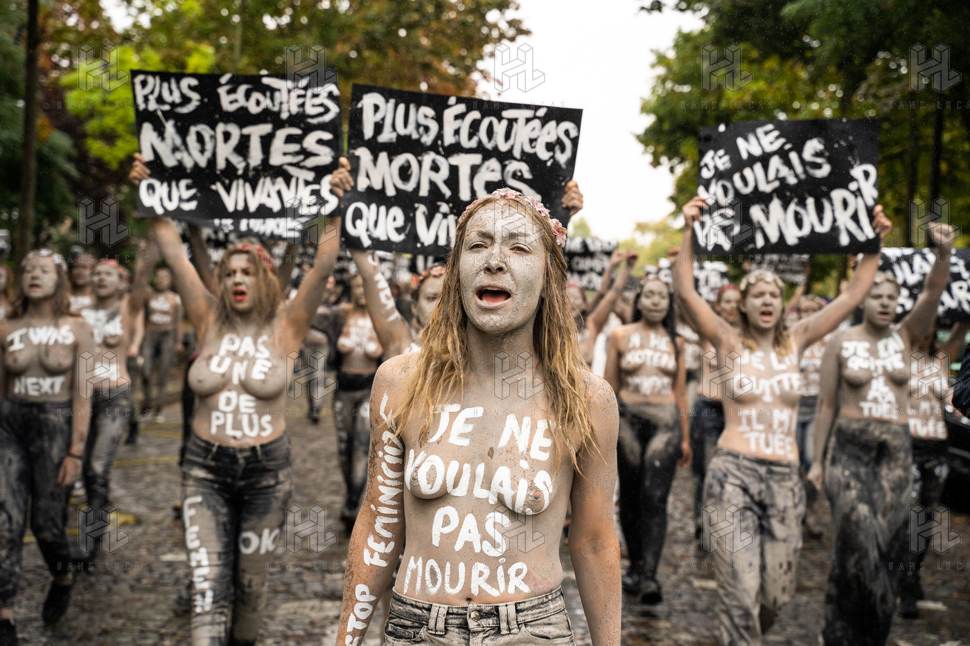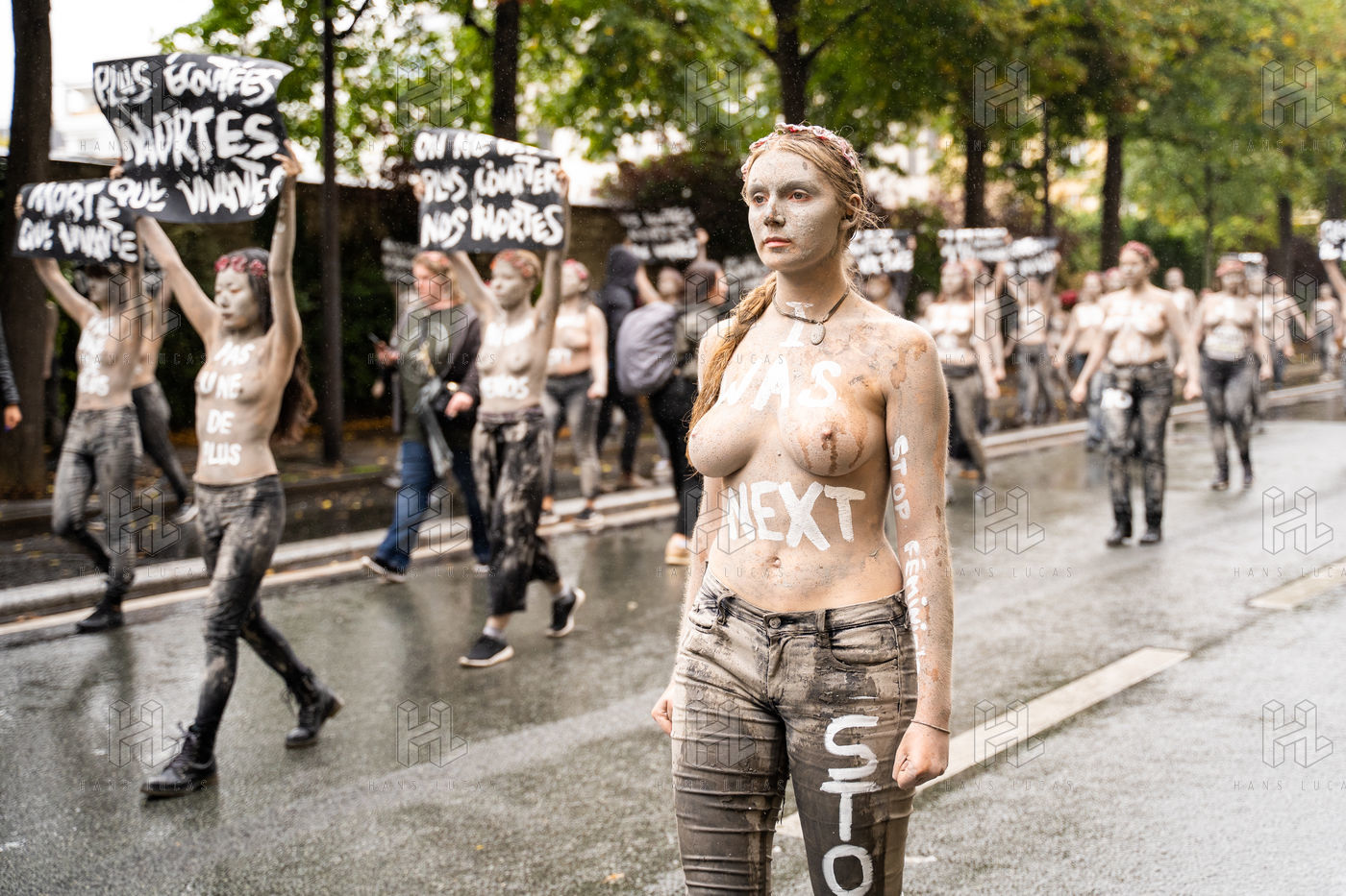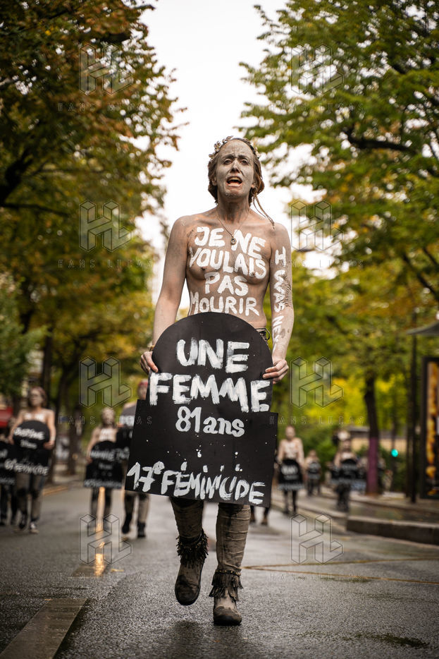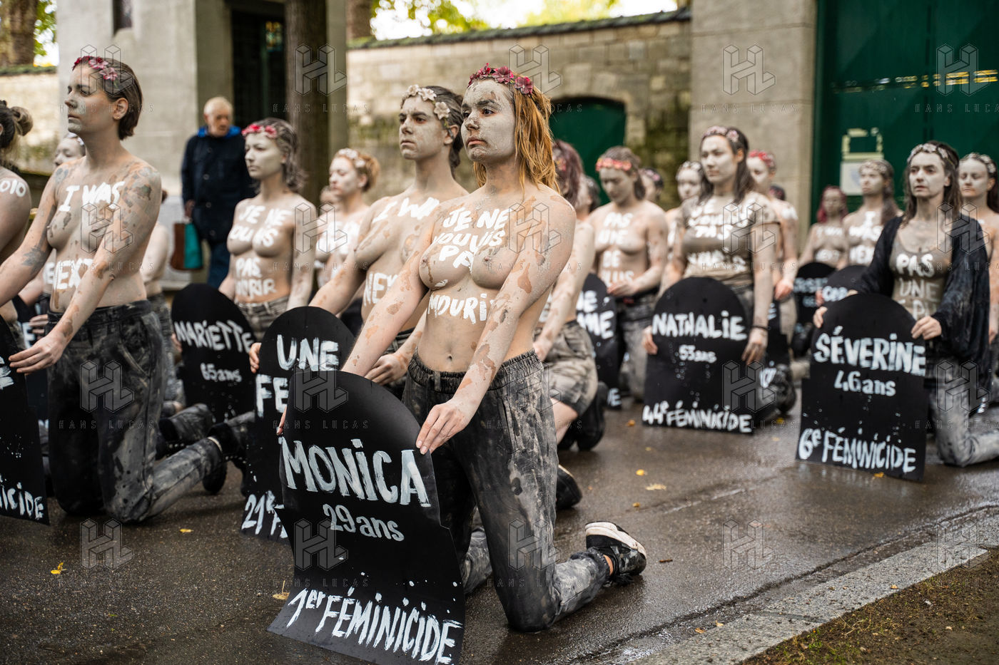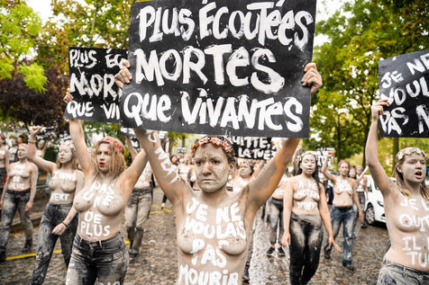 "Plus écoutées mortes que vivantes", dénonçaient les Femens, qui ont défilé dans le quartier puis dans le cimetière, où elles ont posé avec des stèles en références aux 114 femmes tuées par leur compagnon ou ex-compagnon depuis le début de l'année 2019.
