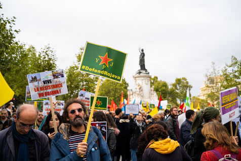 Manifestation contre l'intervention turque au Rojava (Syrie du Nord) par la Turquie et des groupes djihadistes alliés. Le Conseil démocratique kurde en France (CDK-F) appelle à manifester à place de la République contre l'invasion du Rojava par la Turquie qui vient de débuter, Paris 12 octobre 2019.